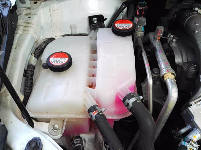 这是与之关联的液冷储存罐。-----看防冻液颜色,应该是天津皆希爱化工的产品,使用周期可以达到变态级 ----- 五年16万公里。