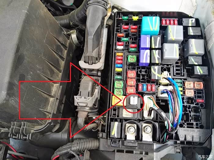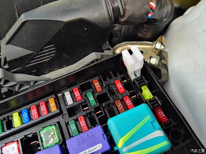 打开电源保险盒,给朋友指出:平时不小心最容易烧掉点烟器的保险丝位置
