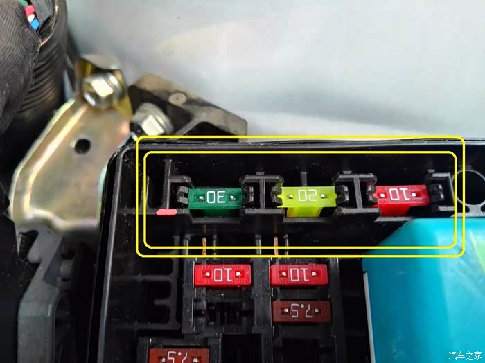 黄色框里是备用的三个型号保险丝,红色10a就是点烟器用的。