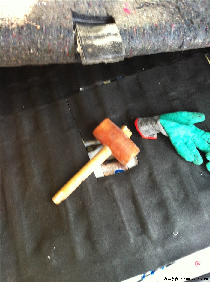 这张是贴上隔音棉后的,我说了我工作的时候全神贯注,所以拍照总忘,偶尔想起来就拿出来拍一下,大家能看明白这个意思就行了。(下面就是主要工具,橡胶锤+手套)