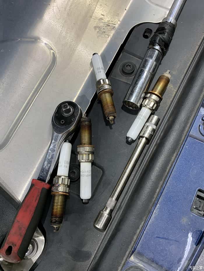 之后换了火花塞,按照宝马官方要求2万公里就得换,我跑了2万6,看论坛有些人说宝马的火花塞可以用到4万公里再说,所以一开始我就没打算换,但是经不住技师的劝说,还是换了吧。刚拆下来的火花塞,看了下觉得应该还能用,可以不换,但是拆下外侧两个火花塞的时候,我觉得人家技师说的是对的,严格按照官方要求,火花塞2万公里左右是得换了。