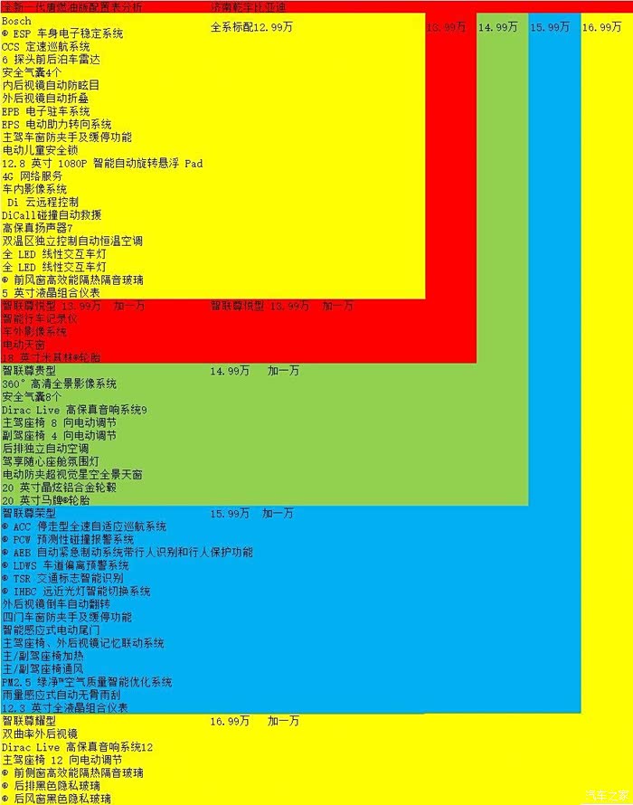 首先,比亚迪的最低配就是其他品牌的中等以上配置了。唐混动版最低配就配有博士ESP全套主动安全配置(这个很多人不懂,关键时刻救命的配置),全景天窗、电动尾门、遥控驾驶、自动空调、电动座椅、LED大灯20寸轮胎,CCS定速巡航,行车记录仪、右侧后方摄像头,全车8雷达,等等配置。这些很多是合资车顶配才有的配置啊。