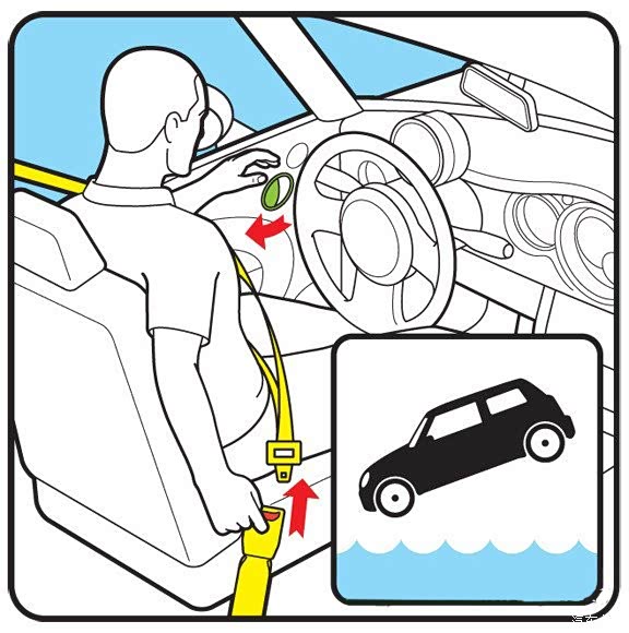 由于发动机质量较重,所以车辆入水后会前倾,驾乘人员要快速移动到车辆后排。车子刚入水的时候,车门外水的阻力不大,要第一时间尝试能否打开车门,可以打开的话就立马开门出逃,因为车子在两分钟之内即可完全沉没,所以动作要快。