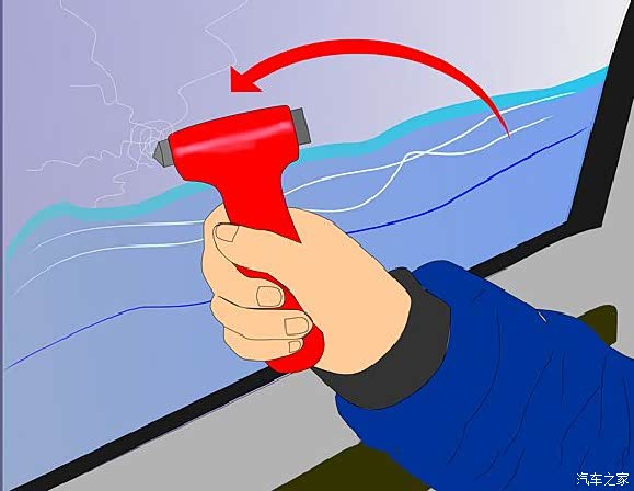 3.如果你无法打开侧面的窗户,那么用尖的东西使劲敲侧面窗户: 如用手肘打,穿高跟鞋踹,用改锥扎。注意要打击玻璃窗的中央。有专门用来砸开车玻璃的工具,也可以买好随时放在车里以防万一。一般来讲车的后窗比较适合逃出,如果引擎在车头,车下沉时头先朝下,尾部还在水上面。车后端顶部会困住一泡空气,可借以活命。