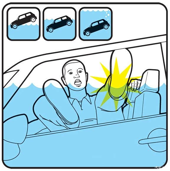6.如果你无法从车窗逃出,也不要惊慌,将面部尽量贴近车顶上部,以保证足够空气,等待水从车的缝隙中慢慢涌入,车内外的水压保持平衡后,车门即可打开了。在水进入车的过程中,用手攥住车内门把手,这样水进入车后你不会漂浮离车门把手。