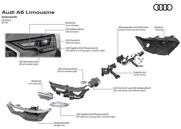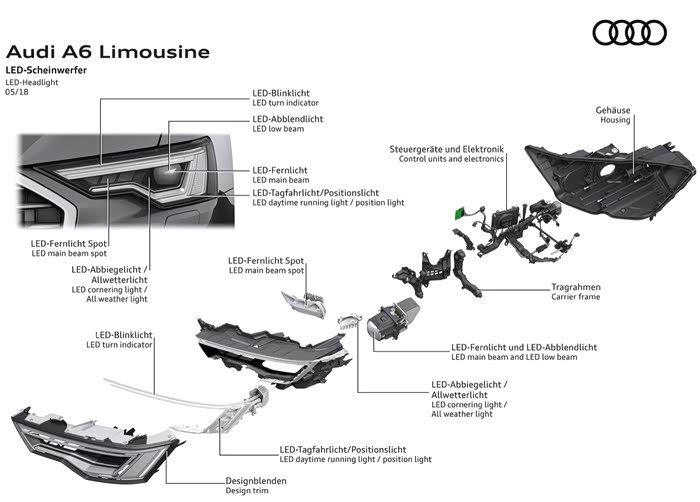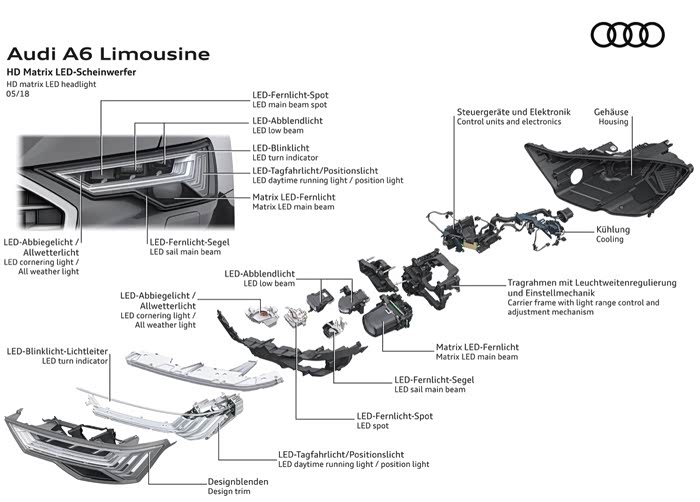 “灯厂”在此次C8代A6L上全系标配了LED大灯,并且分为了三档级别。