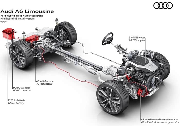 3.0 TFSI发动机采用了48V轻度混合动力系统,从而让全新奥迪A6L可在55到160公里/小时的车速范围内利用惯性滑行,如果驾驶员在该时速范围内松开油门,车辆可在关停发动机的情况下惯性滑行40秒。一旦驾驶员再次加速,BAS就会迅速并且平顺地启动发动机。同时,48V系统还可将发动机自动启停模式的运行范围扩大至22公里/小时。