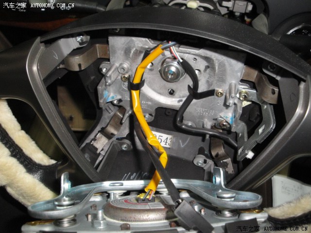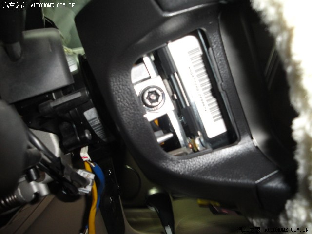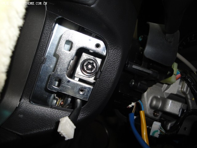 这是拆下定速巡航按键后的方向盘右边的样子,那个白色插头就是接定速巡航按键的。注意那个六角螺丝。