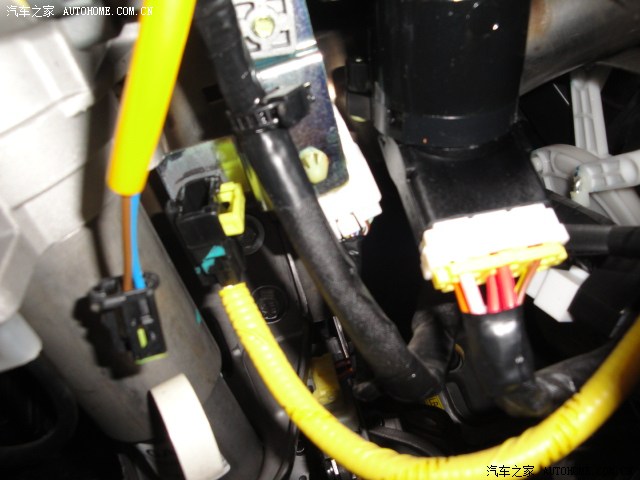 这是位于方向盘下面的气囊连接线,必须把那个黄色插销往外送开,才能拨下来,否则拨不下来。