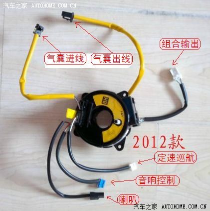 一、咨询准备 我的JC带定速巡航,但也想安装方向盘音响控制按键,经过了解和事后证明,除购买按键模块外,还必须更换方向盘游丝,原来对游丝一点概念没有,是个什么东西,作用是什么,一概不知,还好有度娘,原来游丝的作用就是把一些控制信号线束从方向盘转接到车体里面去,转接就是避免方向盘转动导致信号线缠绕,其实就是一个圆形的塑料盒子,里面有排线如同钟表的游丝(由此得名),盒子分例外大小圆,可以转动,进线接头在外围的大圆上面,出线的接头在小圆的下面。看图:
