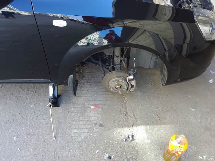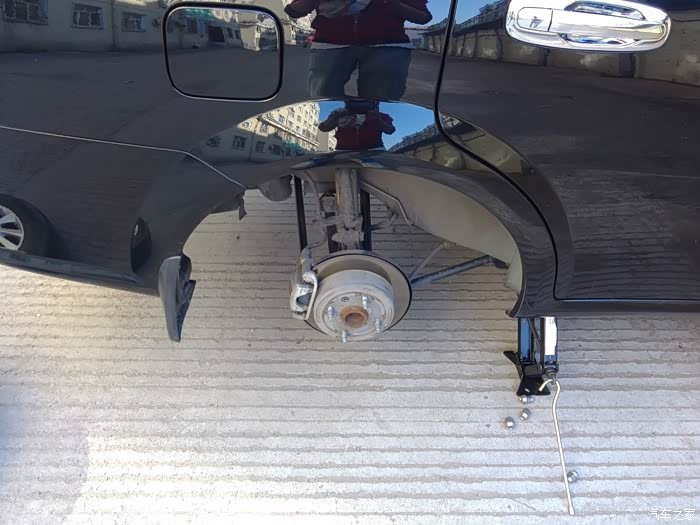 第二步支起右后轮,把轮胎拆下。为什么要拆轮胎还要是右后呢?拆轮胎是因为没有举升机,有举升机可以省略。换刹车油要从最远端换起,这样能最大程度的减少新旧刹车油混合。顺序是右后,左后,右前,左前。