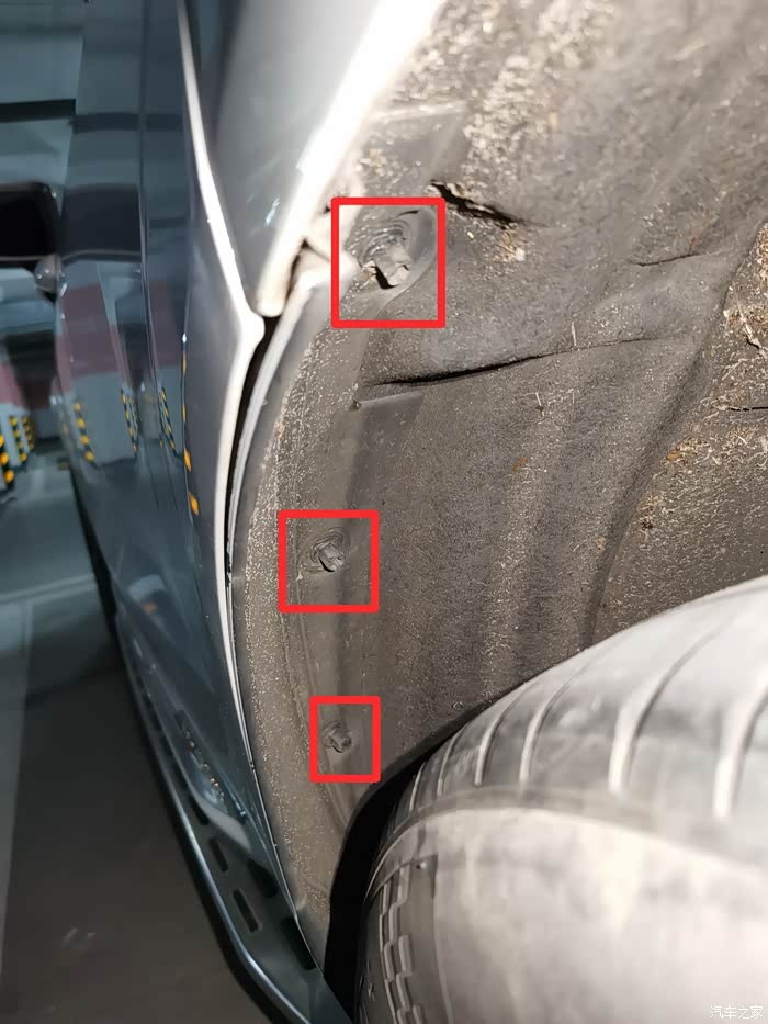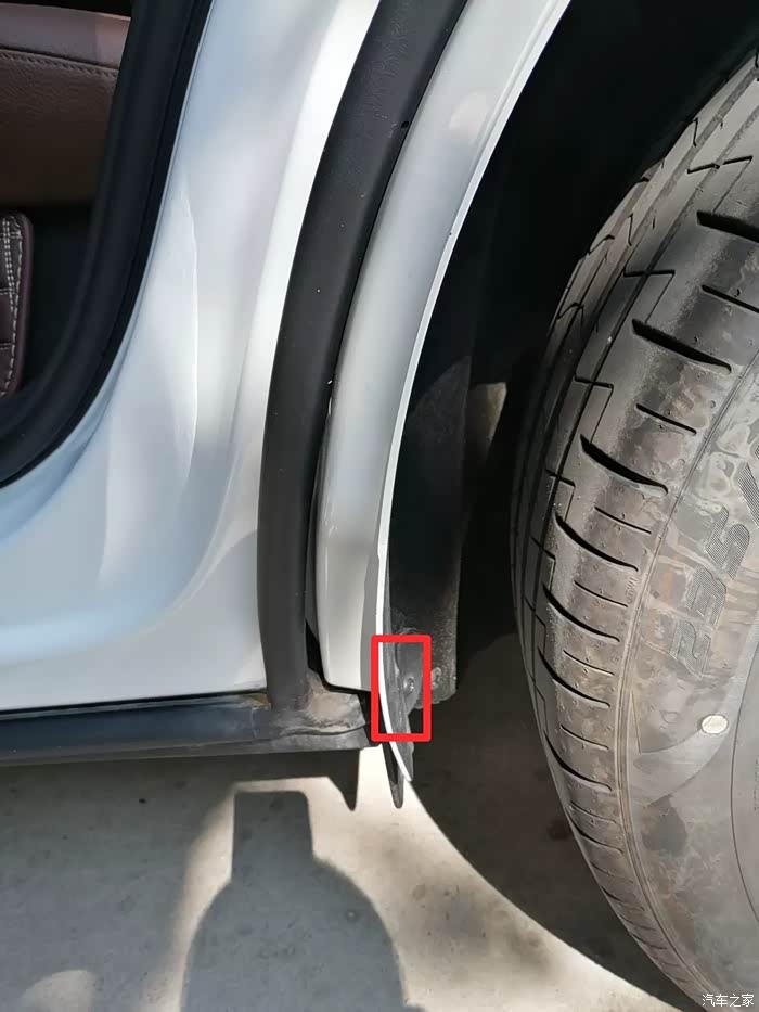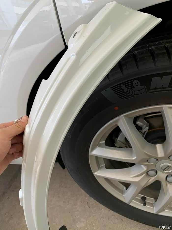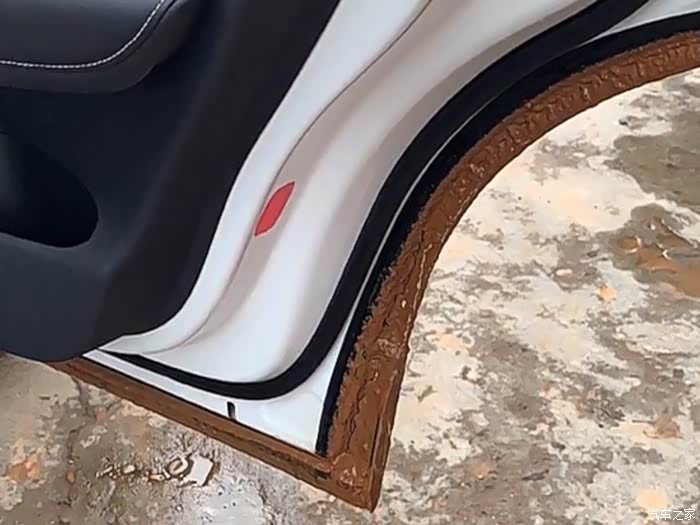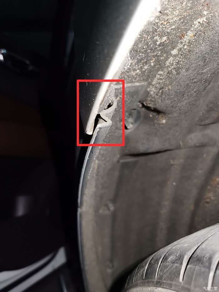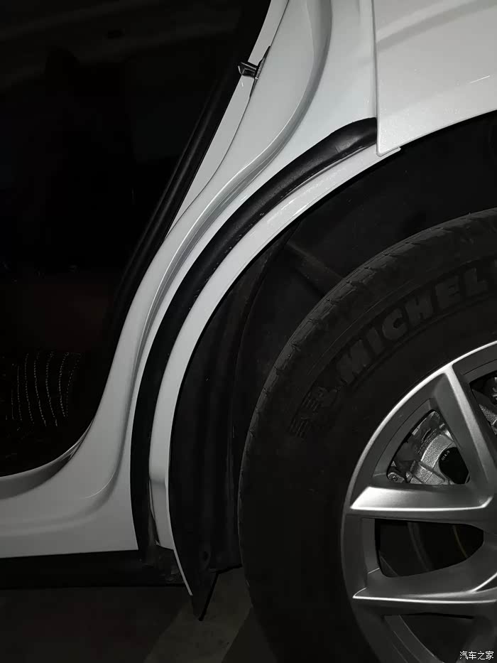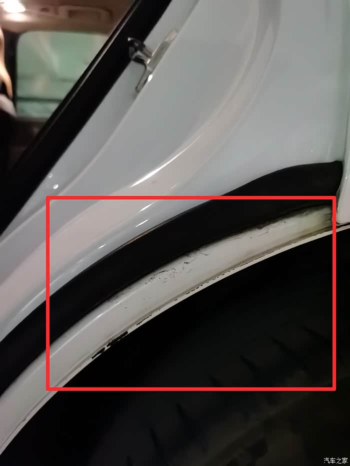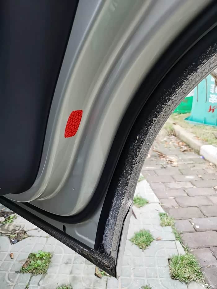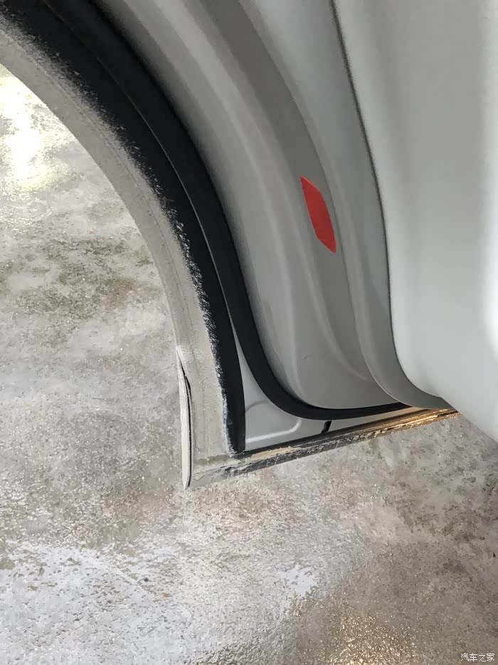 打开车门掉漆问题看的更加明显,加上后轮眉本身难以完全隔绝的泥沙灰尘,出现了上图所示问题状态,如果是黑色后轮眉挡泥板,脏的问题就不会如此明显。那上图所示情况的原因在哪里呢?可以看下图所示: