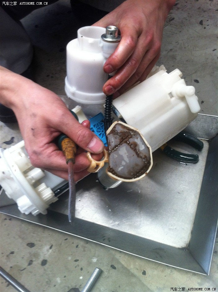 事情起初是因为本店售后前几个星期来了两辆丰田大霸王的商务车,车主反映车子加油不畅,甚者加不上油,120油门踩到底。经检查,需要更换汽油泵以及泵上粗滤网。两辆都是公里数比较高的车子,我们猜测是由于长时间没有更换汽滤造成的堵塞。