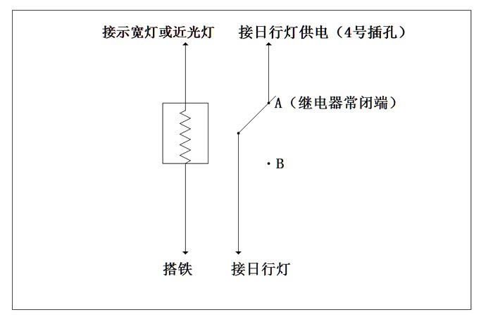 图20、继电器接线方法可参照图20,此种方式是开示宽灯或近光灯后日行灯关闭。若要实现开示宽灯或近光灯后日行灯降低亮度而不关闭,则可以在A、B两端焊接一个1w以上的电阻,电阻阻值需要根据不同的日行灯和自己需要减光的程度而定。