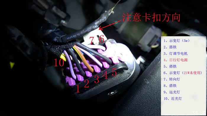 图6、每根接线的作用(此部分是重点),请注意插头方向:插孔朝下、白色卡口方向朝左,8、9脚因图上不好标注,按顺序数即可。只要弄清楚了每根大灯线的作用,今后安装日行灯时不论是找示宽灯、近光灯或远光灯来控制日行灯关闭或减光,都十分方便,同时还可灵活运用,比如把1号线和4号线互换一个位置,示宽灯就变成日行灯了,真是一图在手,万事不愁!