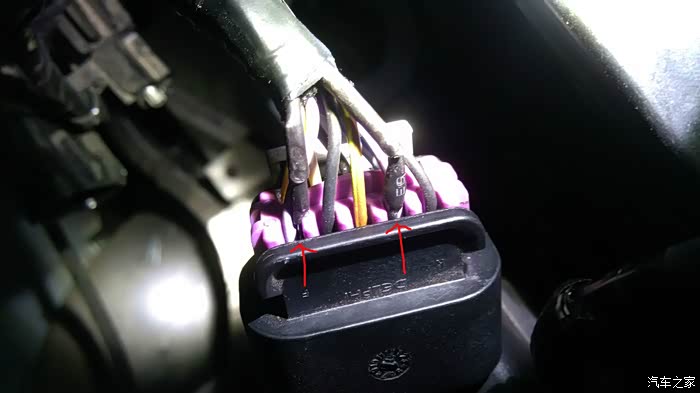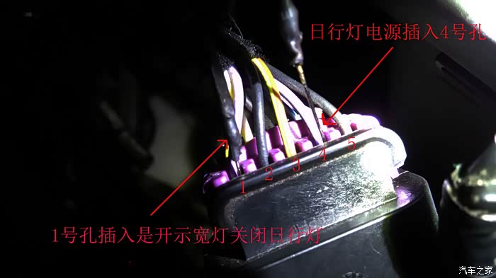 图13、插入后将引出线用绝缘胶布缠好,然后再将线束插头插入大灯插座上即可。我是在1号、4号孔位取的电,ON档(含点火后)即亮,打开示宽灯即灭(需要加一个继电器),效果很好。