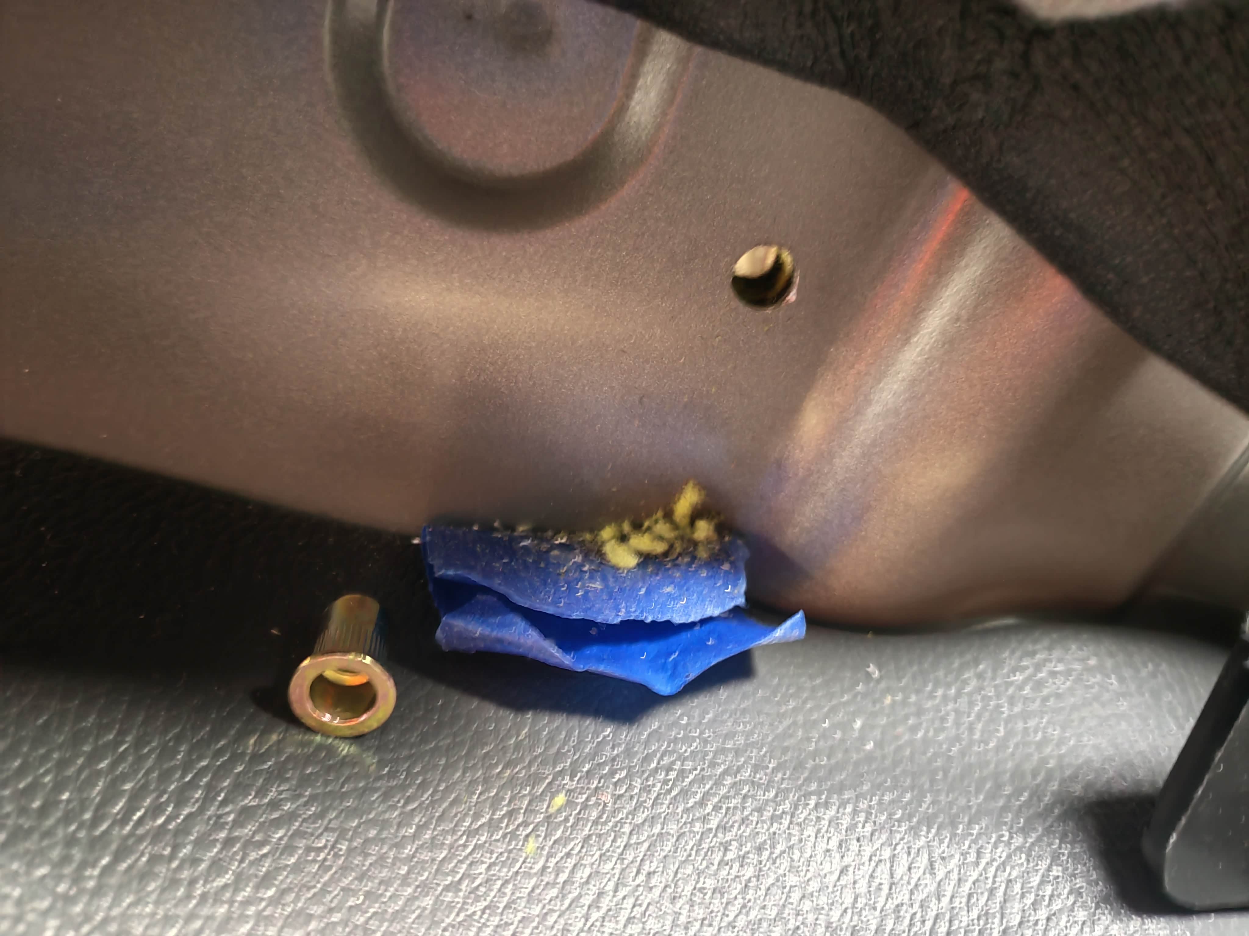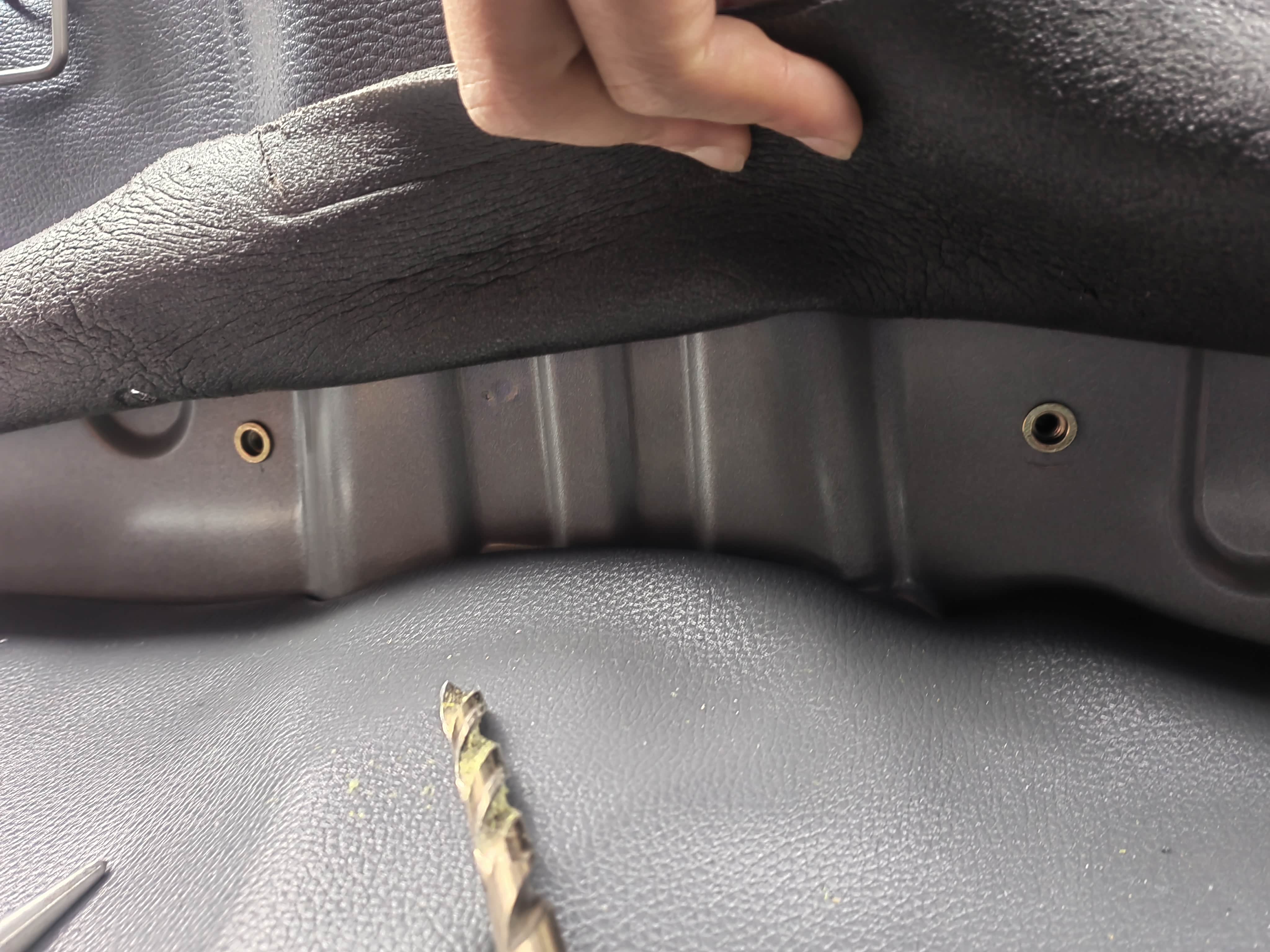 由于23款之光1.5减配了水杯架下方固定螺丝孔,可以钻6mm通孔并在反面加螺母,或者自攻螺丝。本次采用拉铆螺母,正好学习下。先在副驾侧钻9mm孔,螺丝孔位置是在固定了上方第三颗螺母后,大致比划确定的。