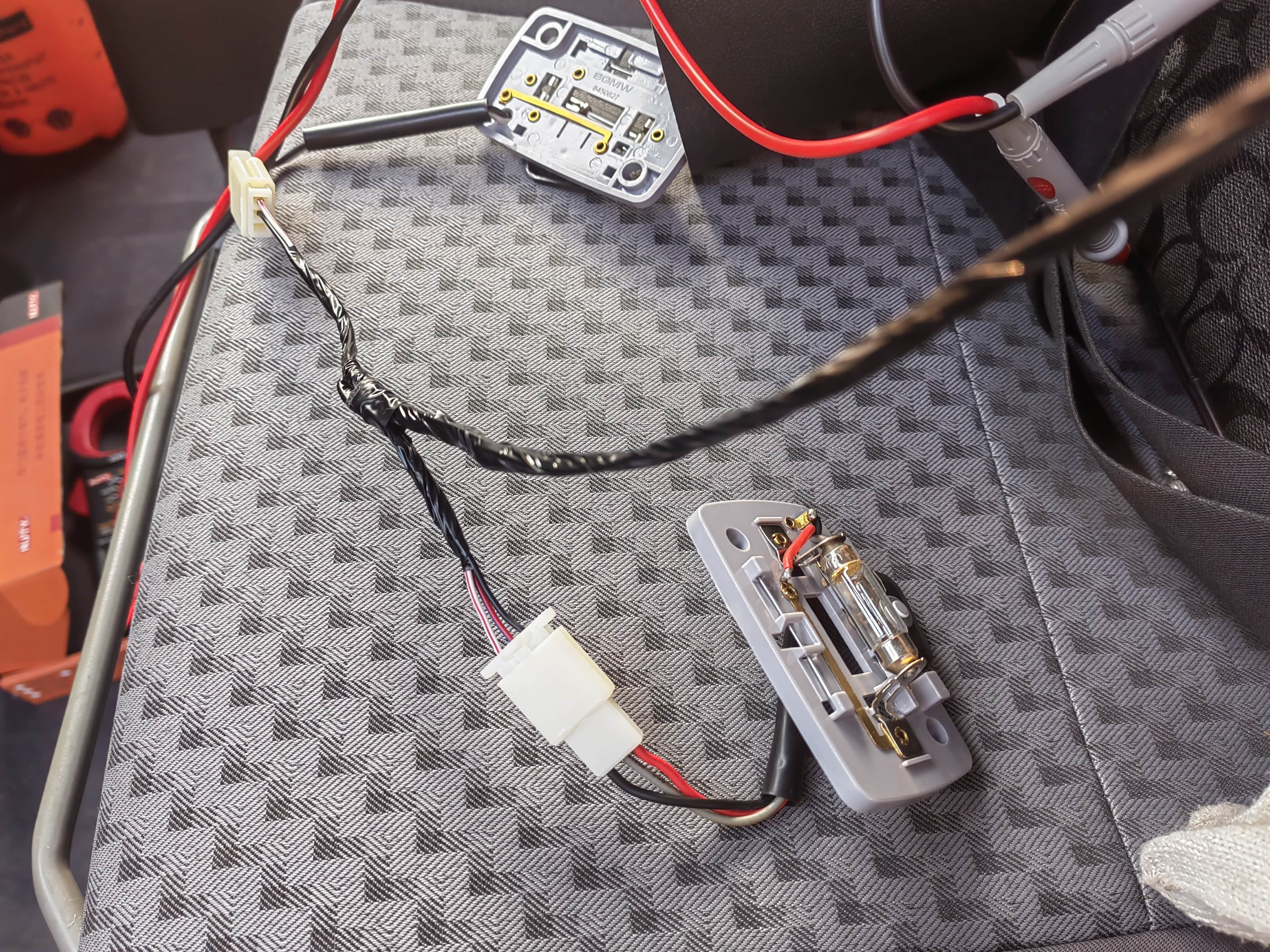 预留插头有三根线,其中黑色地线(0V)/红白电源(12V)/红蓝门控(0V,没有意义了)。插上后阅读灯,注意电源和地线是反插的,好处是开关在关闭位置时,是地线0V通过灯丝到门控0V,灯灭。
