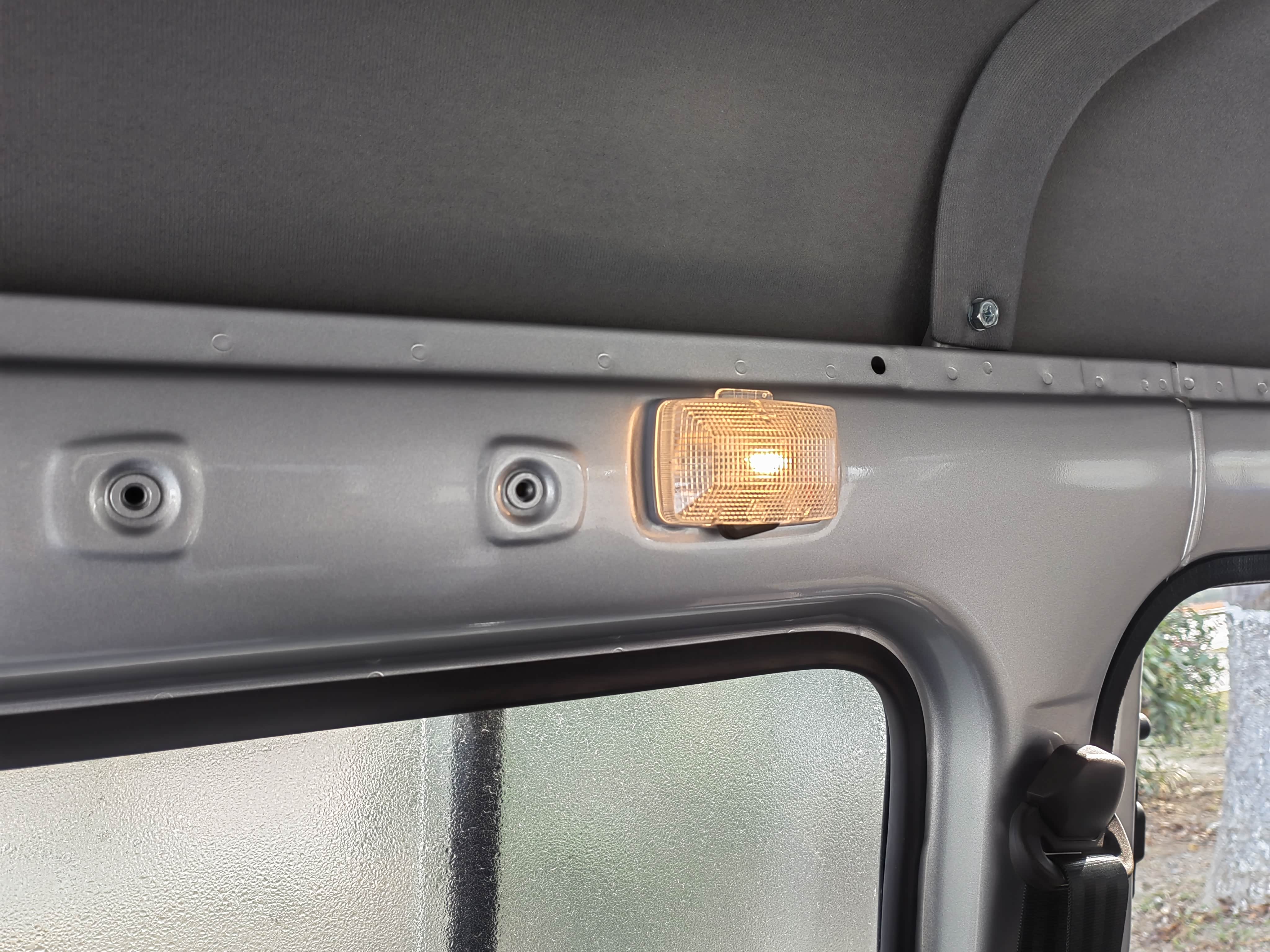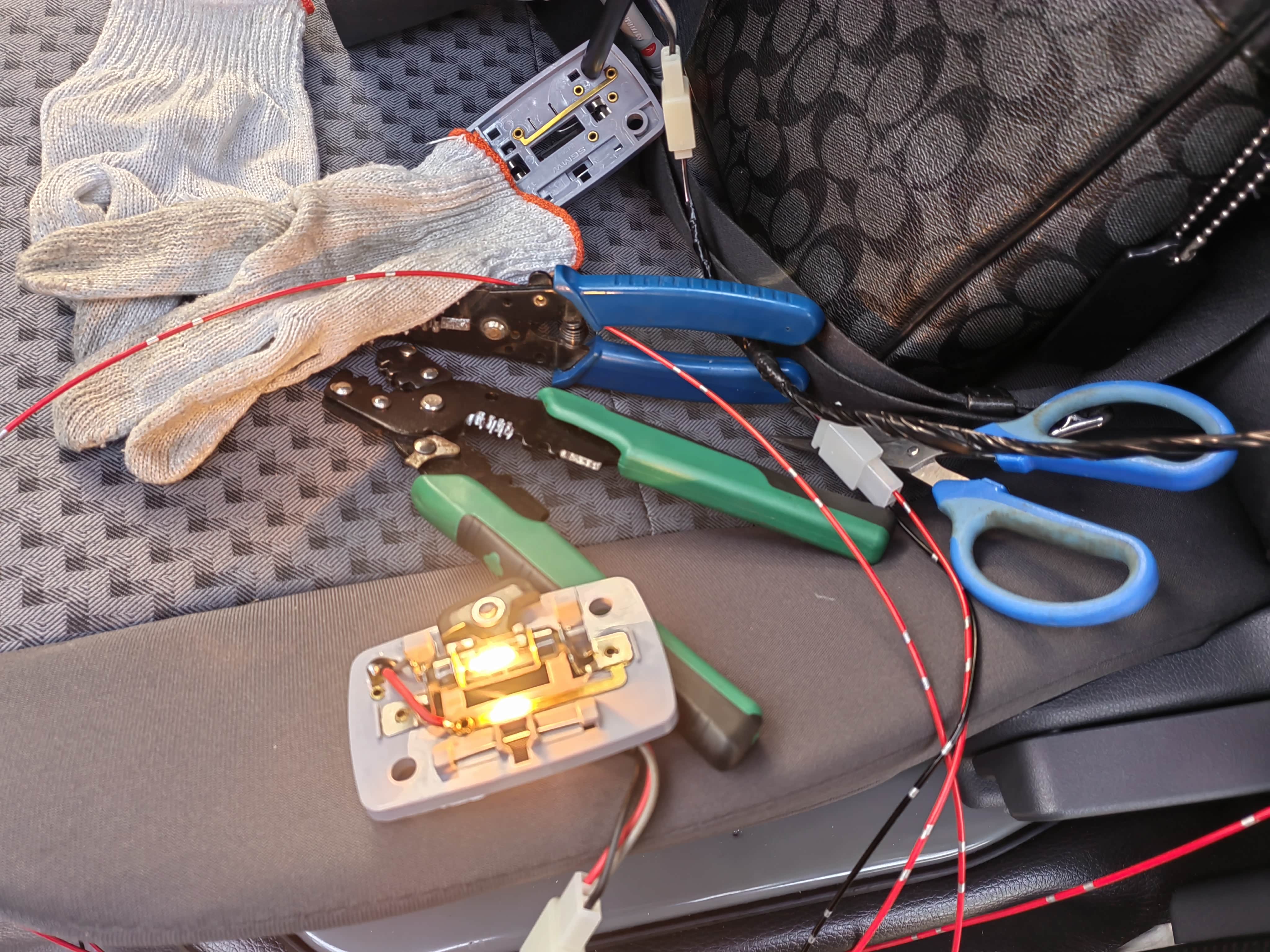 接下来制作从前到后阅读灯的延长线束,为了避免麻烦,只接了电源12V和地线0V。因为五菱之光的阅读灯开关只有两个模式(开灯和门控),要实现关灯模式,只能不接门控线,否则得增加一个额外的关灯开关。