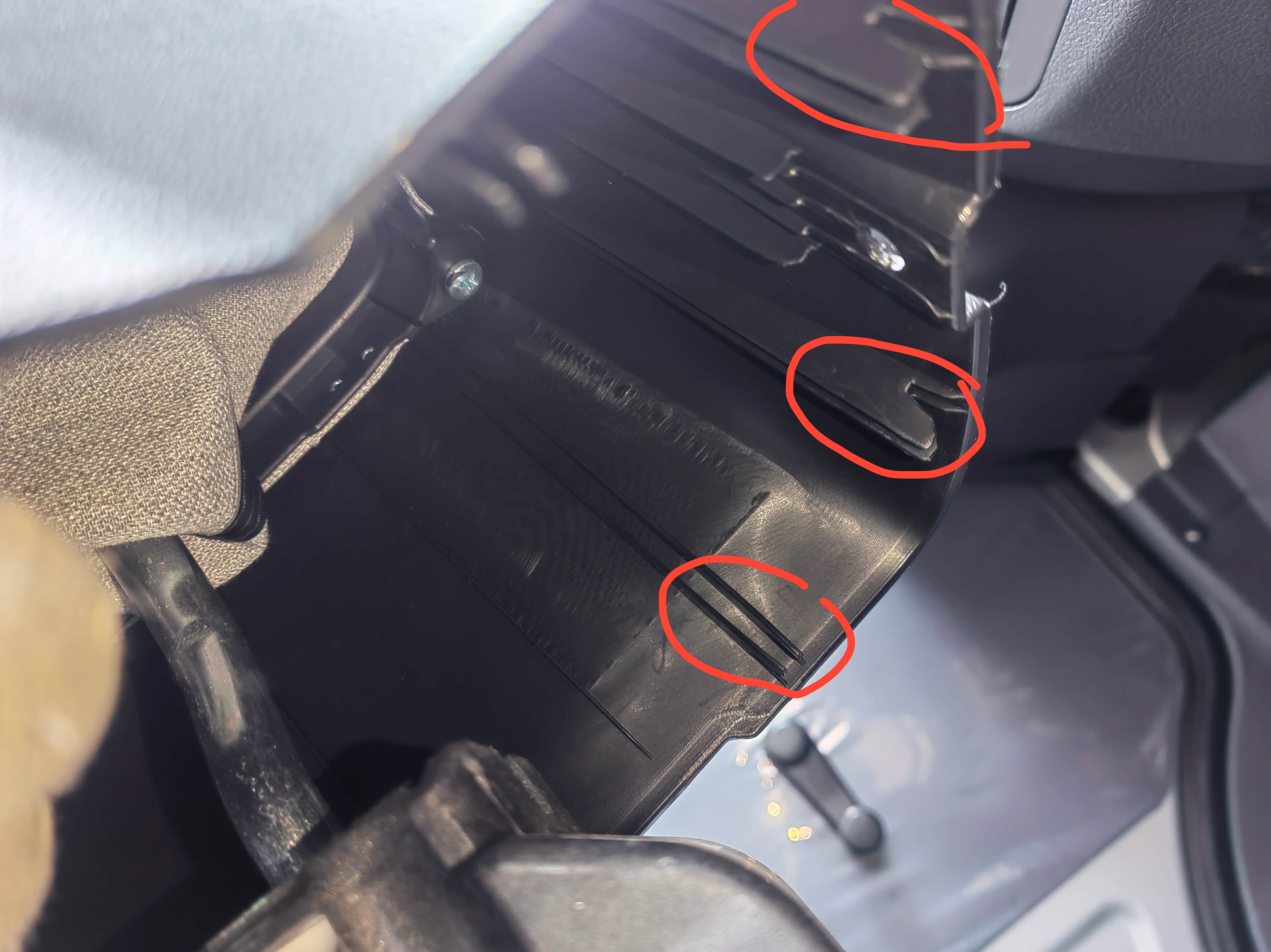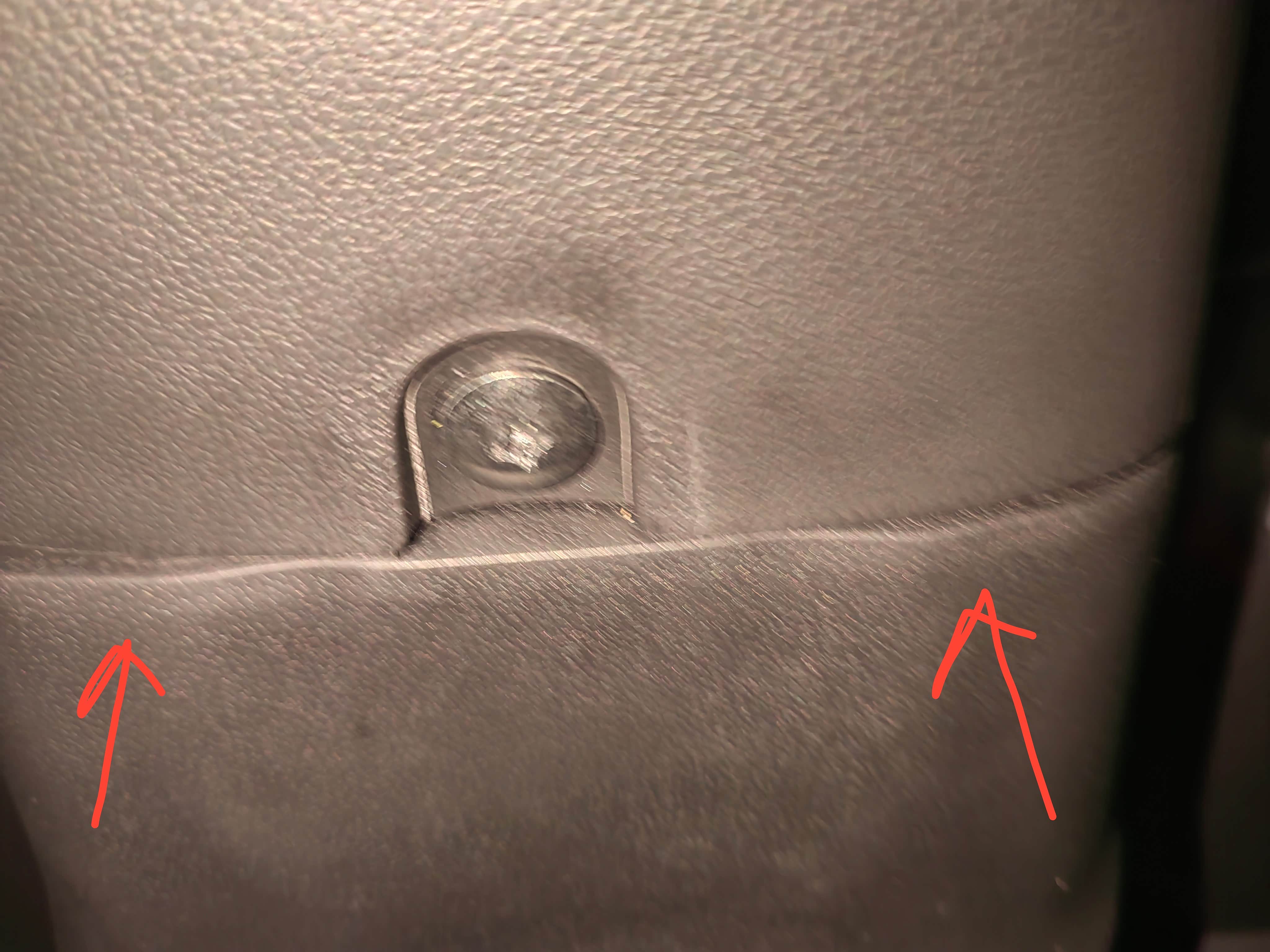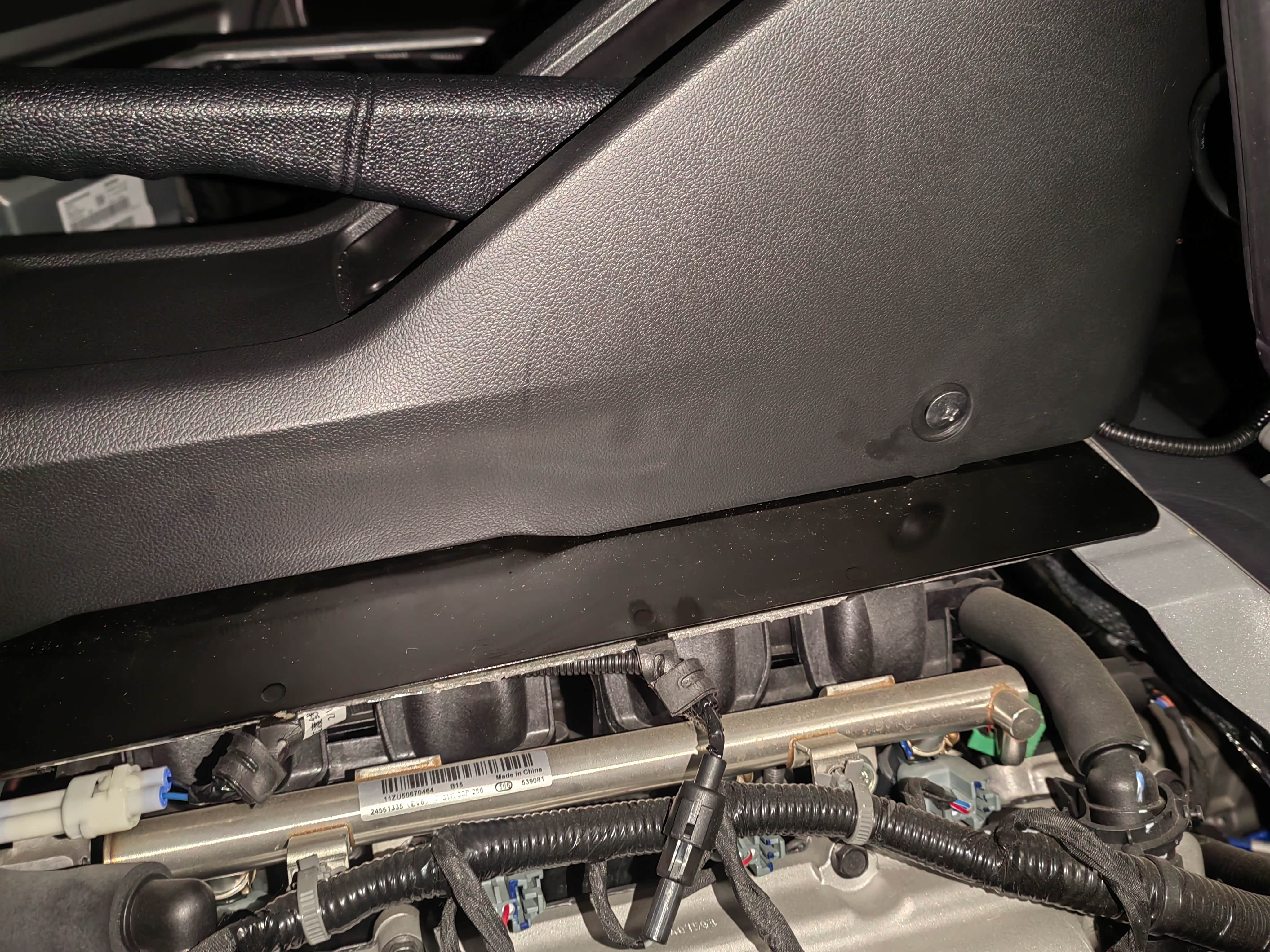 前端部位,水杯架是中间凹两侧凸的“M”形,而23款手刹盒是个简单的“n”形,安装后应力依然不小。由于上方第三颗螺丝孔凹陷深度不一致,该处塑料板已发白有开裂,回头得在手刹盒与水杯架螺丝孔间适当加垫片。
