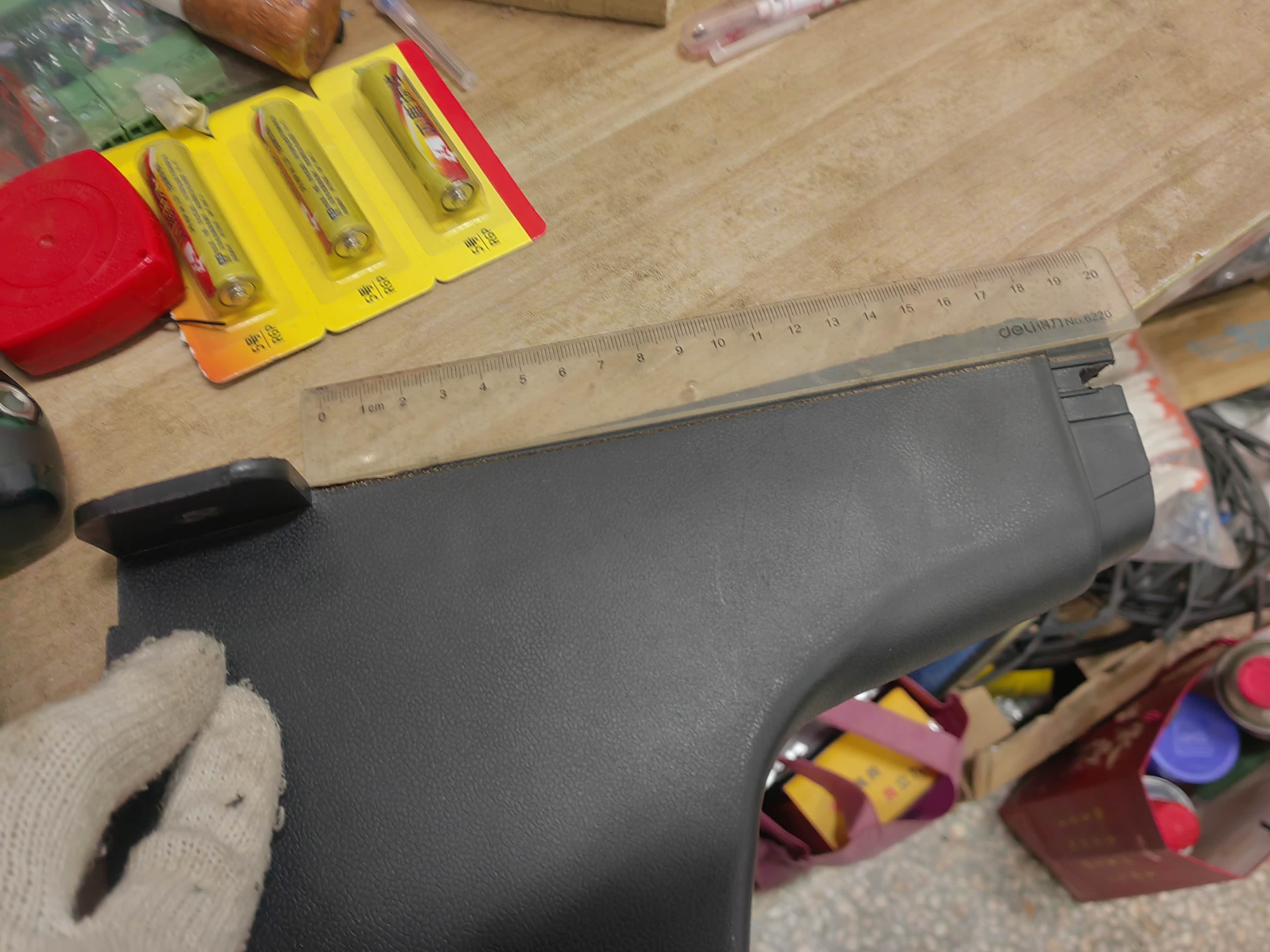 为了尽可能不改变原车手刹盒,决定把6388水杯架按照尺子方向裁剪,上方最多往后剪掉1cm(因为有根加强横梁挡住),下方斜着过渡到螺丝固定片上边缘