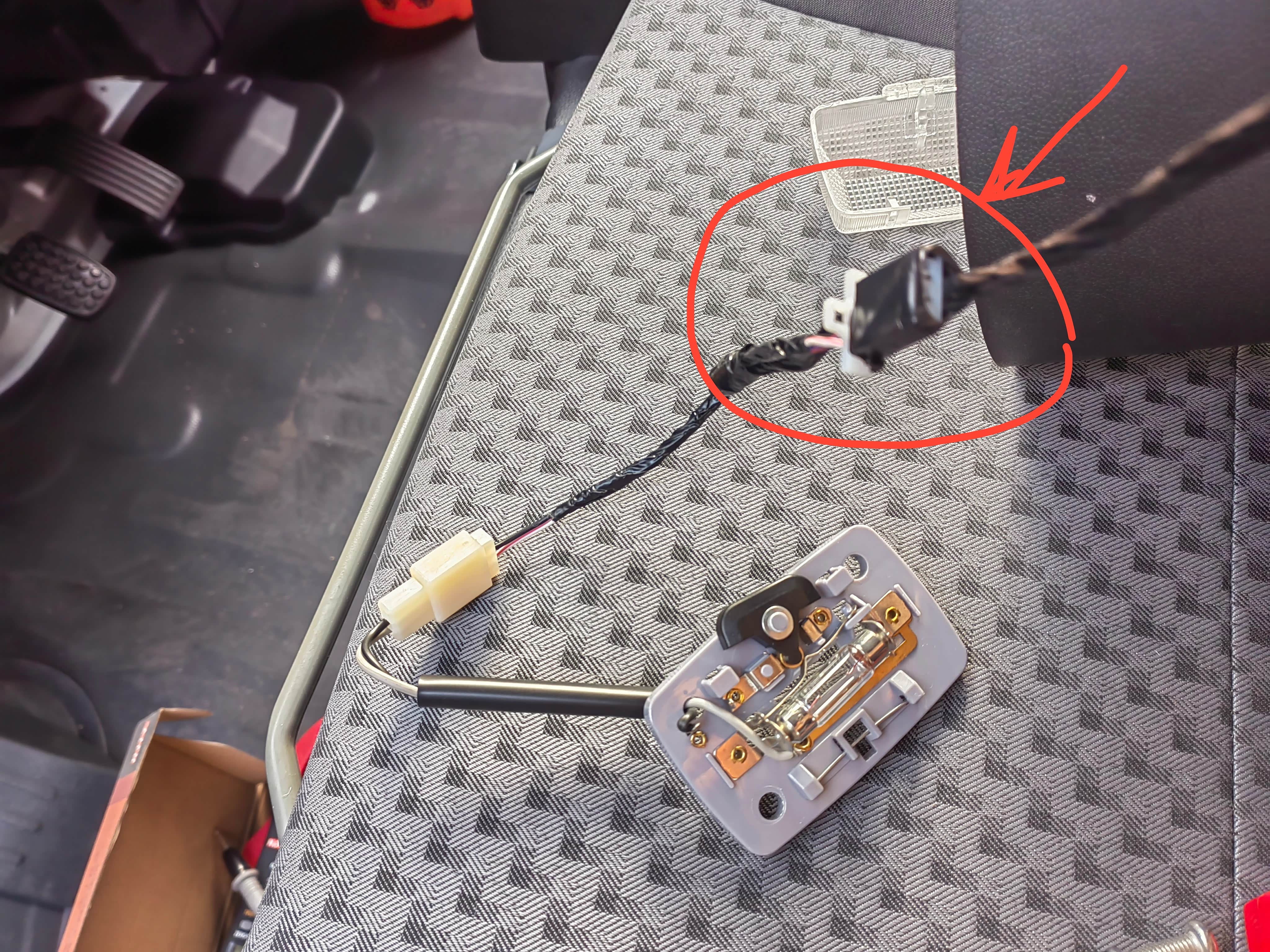 本来准备直接去破线并联引出后阅读灯线束了,却突发奇想把前阅读灯线束完全取出来想看看,结果发现有个预留后阅读灯的插头(红圈处)。这是好事,而且说明五菱还是存留了一点靠谱