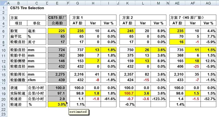 利用网上轮胎计算器测算,平衡多项需求后,基本确定两个方案: