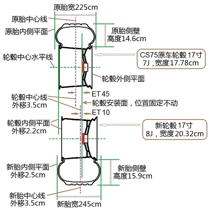 ET10的偏距接近零值,中心面比原车外凸了3.5厘米,8J的宽度增加2.5厘米。