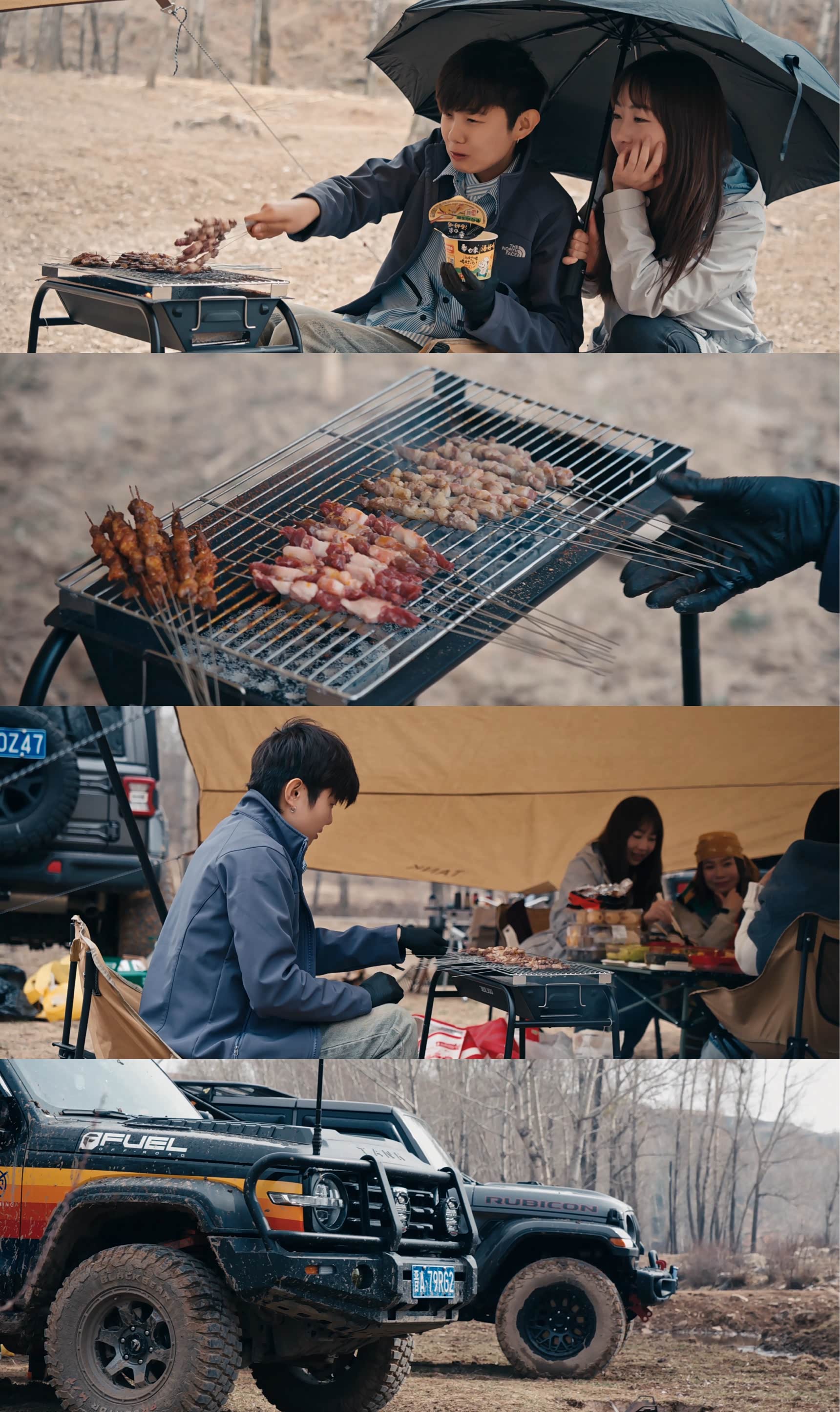 到了目的地,找了块开阔的草甸子停车,打开后备箱开始搭天幕、架烤架。坦克300的后备箱空间够能装,天幕、烤炉、食材、桌椅、茶具还有一堆零食饮料,塞得满满当当还不挤。搭好天幕第一件事就是摆拍!把咖啡杯、茶杯错落摆在桌子上,再放上几串刚串好的肉串,坦克300硬朗的车身当背景板,随手一拍都是户外大片,朋友圈九宫格直接凑齐,评论区全在问地址和车!