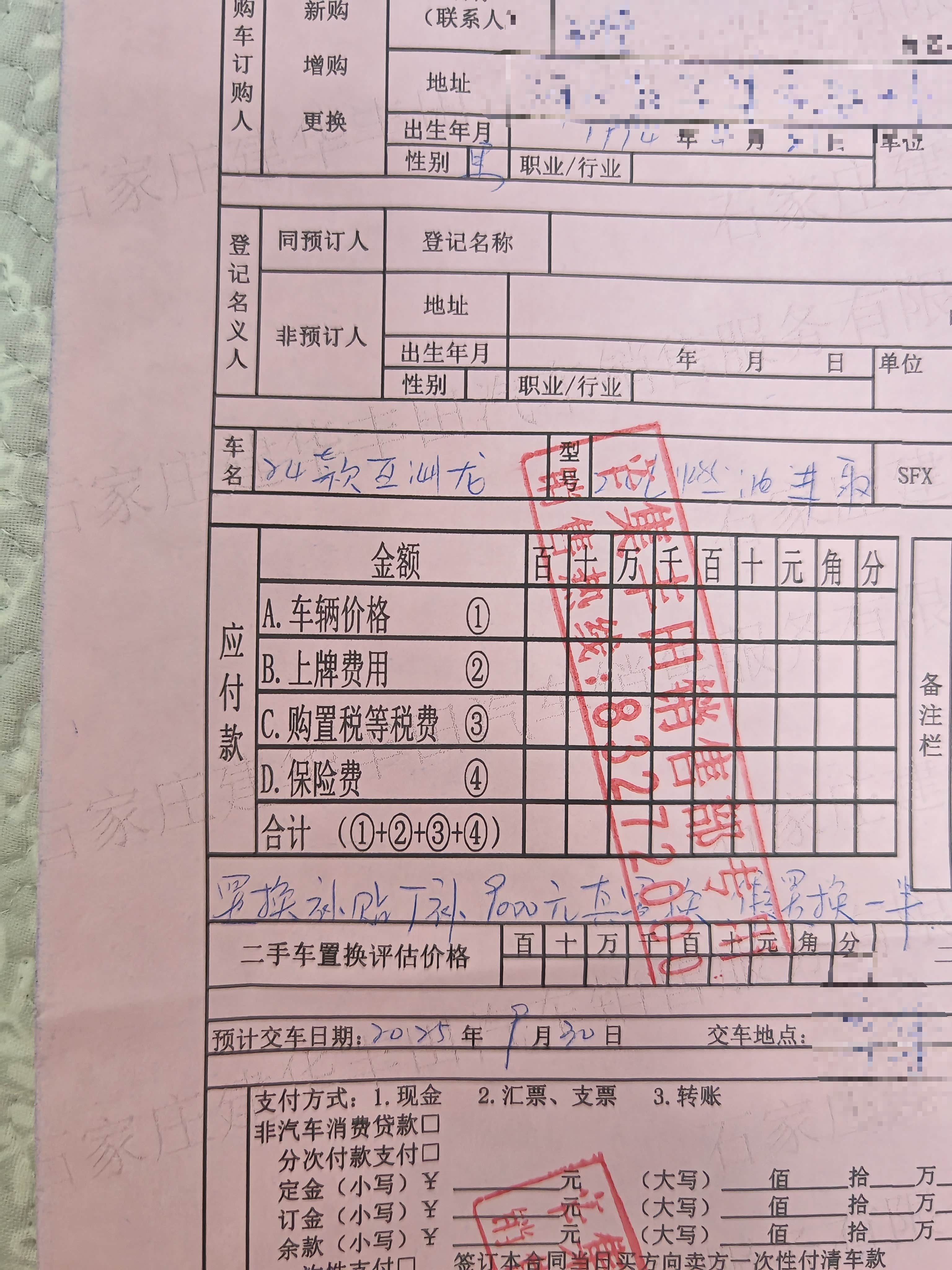 确定车型以后就开始转店对比吧,我们周边的四五个店,还有外市的几个店都看过,几乎每个月给都会分别去不同的店里了解了解,最开始给出的优惠是三万八,最后跟一个店里小伙子混的熟了,感觉人也挺实在,他说可以给到4.2的优惠,然后本地还可以走个4千的地补,算下来也还行,不过心里还是想着在我们常保养的店里去买,想着离家近,赠的保养去也方便,最后去的我们这,说优惠4.3,落地下来15.4,本来在帖子里和车友们学的一样费用一样费用的砍,结果4s根本不接招,就说落地价,本来心里价位是15,后来对方明牌说这个价格不可能,去周边的店里15这绝对让你开不走,想着也差不了多少钱,砍到15.2成交了,然后加了2千赠了360全景和真皮座椅,还有3次保养,不包含首保,最终落地15.4,尘埃落定,也不知道各项价格多少钱,不过最后出了发票以后看着4s给低开了12.38,我算着开这么低的价格他交购置税最起码也得省一千多块钱,保险的话当初算着写的是7500,后来上牌去的时候用我的手机交的,才4800多,真坑,不过没办法,谈不下去了,低了这个总价不卖,上牌费也就是120块钱,零零碎碎的就不算了。最终就是15.4减了省补1万,厂补0.9,旧车给了4s残值1万,12.5吧