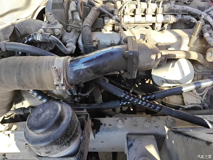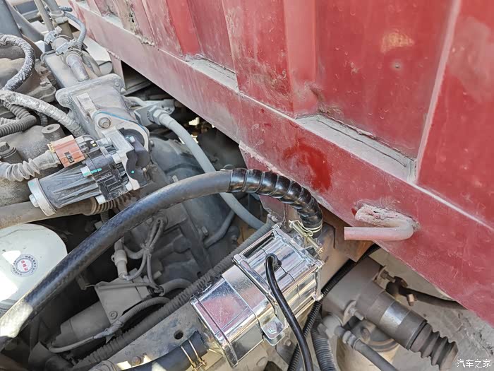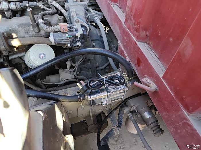 安装就一根支架螺丝,然后和主机固定就行,另外在车架上找一颗螺丝固定就行了,非常简单,接下来就是装水管了,我是找的小水箱出水管串联就行了,因为小水箱的循环绝对是一个小循环,所以把小水箱的上水管去掉,然后把这个加热器的水管按照水流流动方向串联进去就行了,发动机缸体出来进加热器的进水口,出水口接去小水箱的口子就行,安装一共用了20分钟,用店家配的水管和卡箍连接就行,没有难度。