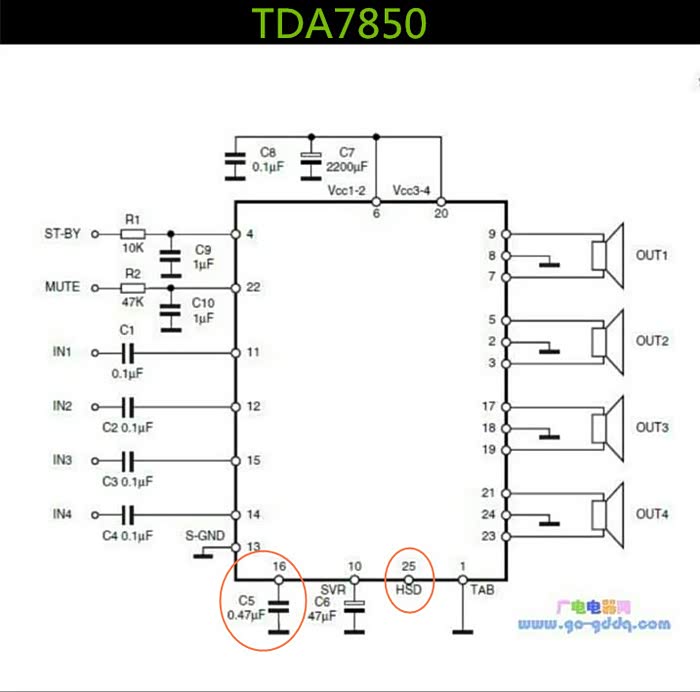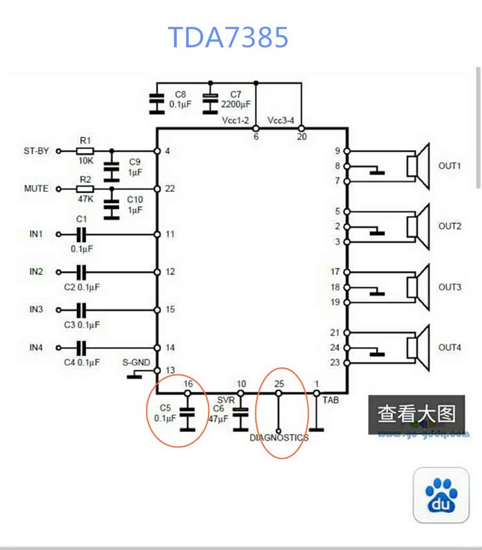 TDA7385和TDA7850有两脚不同,分别为16和25,如图。16脚0.1uf换为0.47uf, 25脚空置。关联了一个25V2200uf电容。