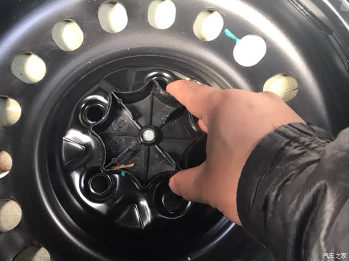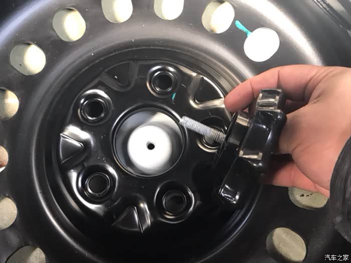 安装备胎,装回车轮固定螺母,使用车轮扳手顺时针拧动每颗螺母,直到车轮固定在轮毂上,安装螺母装饰帽,逆时针转动千斤顶把手,降下车辆,完全降下千斤顶。