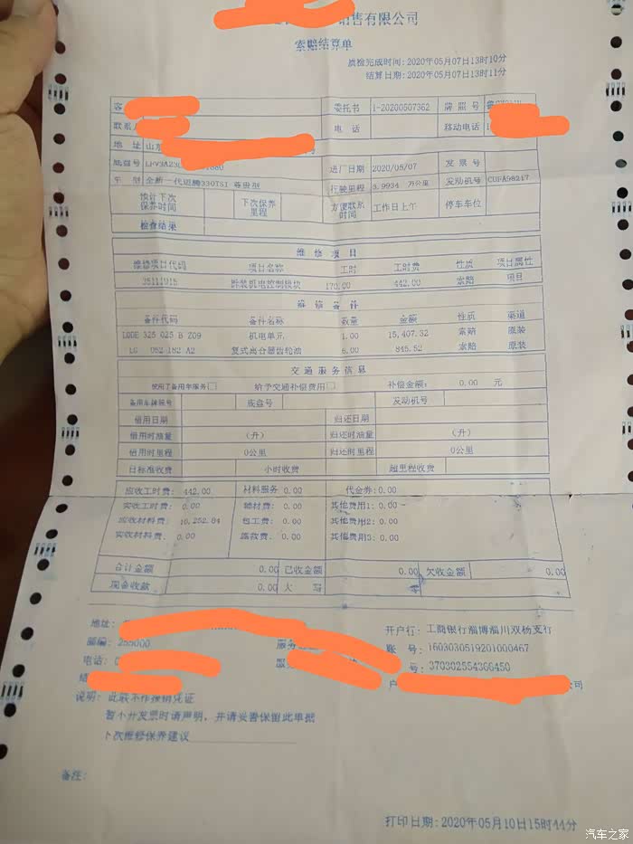 言归正传,自2017年5月份提B8以来,用车一直很愉快,对操控、噪音、油耗等还算满意。但也存在一些小毛病,比如前部泊车雷达故障导致行车电脑报警、感应雷达误报警等,可是始终也没有太大的毛病,可是在2020年4月30日下午(距离出质保期还有一个月左右的时间),我开车正常行驶,先是走了一段拥堵的烂路、又走了一段高速,在下高速行驶一个小时左右后,突然行车电脑显示“变速箱处于紧急运行状态,无法挂入倒车档”,我心中咯噔一下,然后在等红灯的时候接着挂入倒车档,结果真的是无效。马上联系了4S店的售后顾问,他让我熄火重新启动,可是问题依旧没有解决,而且变速箱开始跳档,从1挡跳入3挡,3挡跳入5挡,2,4,6挡已经无效,行车电脑同时显示发动机的故障灯。当天晚上就将车开到4S店,五一当天就进行了检测,销售顾问告诉我已经初步确定是机电控制单元的毛病,但是还要拆下来看里面有没有碎屑,如果没有,才能排除变速箱的故障。5月2日,很庆幸,销售顾问告诉我机电单元里没有碎屑,已经将数据发给厂家,并提交了索赔申请。5月4日,厂家同意申请,更换机电单元。5月5日,订货。5月6日,配件到店。5月7日,安装完成,故障排除,两把车钥匙重新做匹配。到目前来说,一切正常,没有其他车友说的油耗增高,换挡卡顿等情况,不过还是要再观察观察。友情提醒:车子还在33个月内的车友,为了安心还是买上延保吧!起码自己心安。