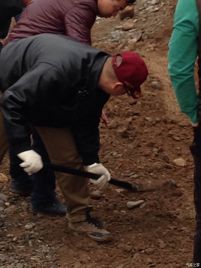 车友们克服艰难险阻,各种装备齐全,携手共进挖出一条上山路。