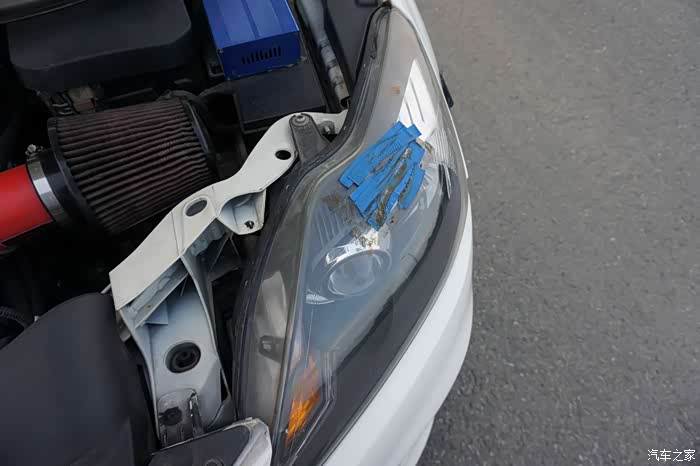 由于改了机盖延伸,车主怕把灯弄花还贴了电工胶布上去。