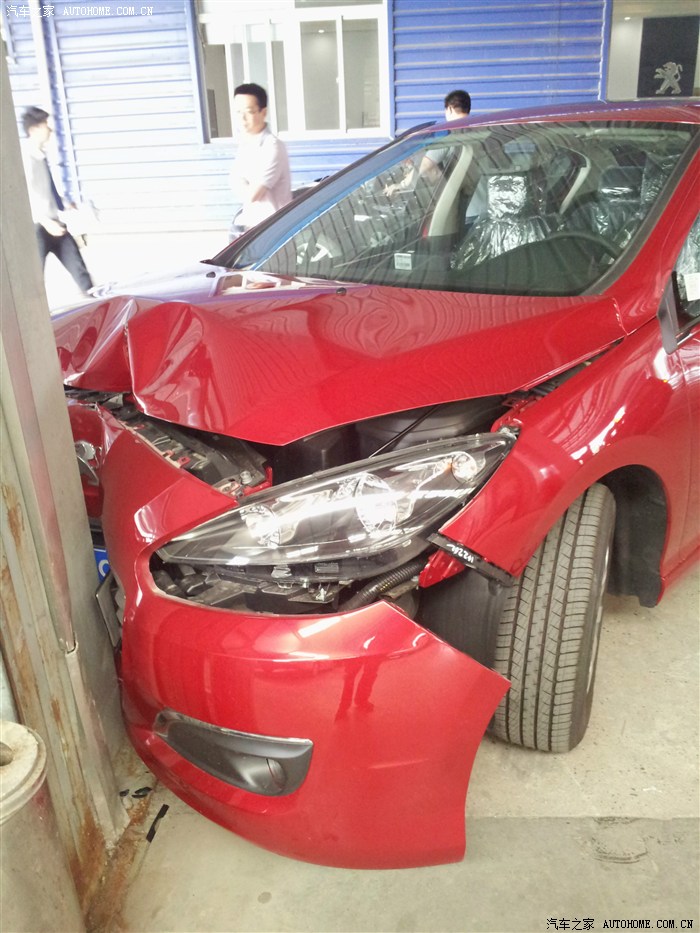 一辆崭新的308,想左转弯开进车间,油门踩的很猛,发动机欢快的咆哮着。我正好站在车间门口,就看到司机(没穿4S制服,应该是车主本人)很摆的猛打一把方向盘。然后就是“砰”的一声,然后就冒烟了……