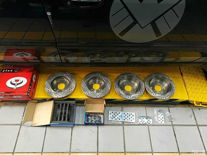 因为车重增重了很多,原厂刹车给人感觉太肉了,直接换划线打孔碟刹盘,新的刹车片