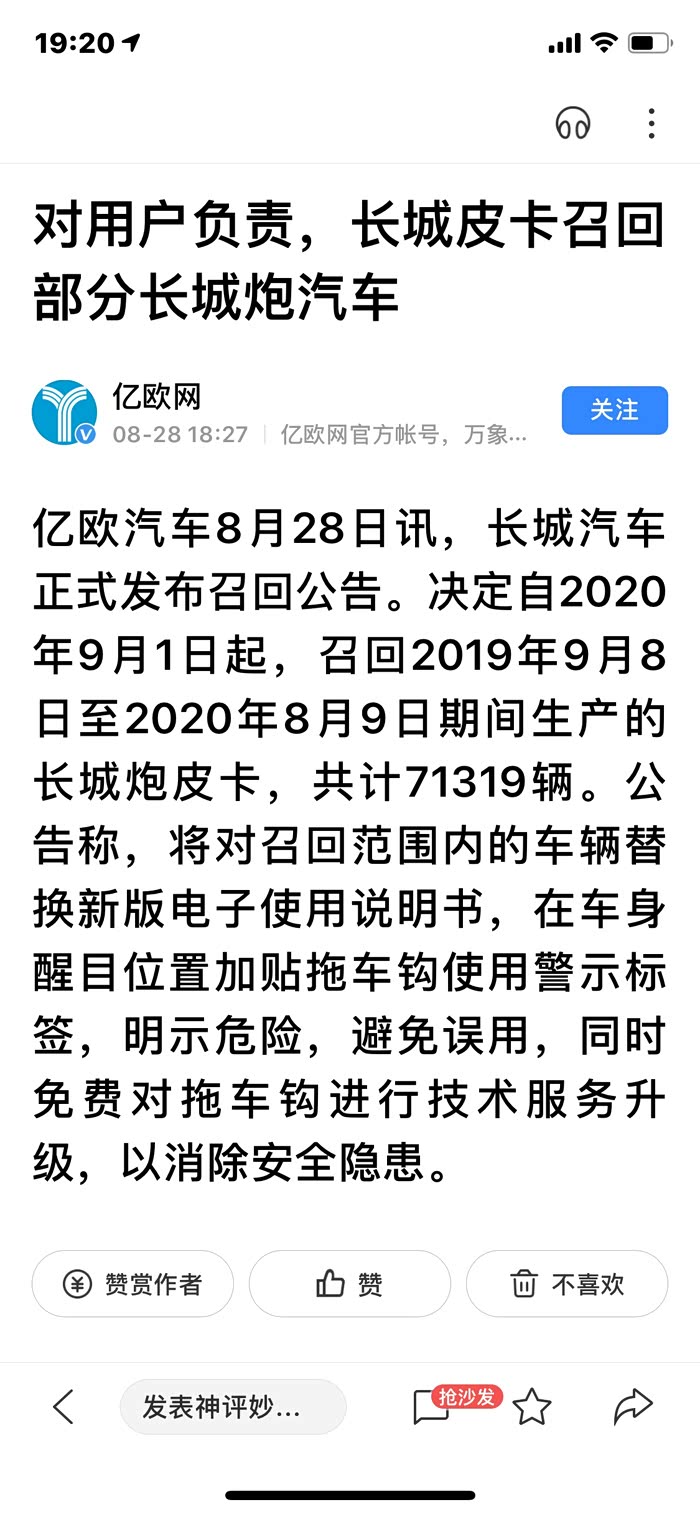 长城炮针对拖车钩召回了,不知道是不是真的!