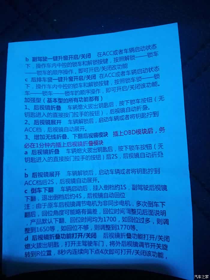 在预算外的一笔钱,买了个自动锁车折叠模块,既然**了就装的厉害点,买来的模块说明书,比较意外的是还多了一个一键升窗,主要的功能就是遥控开关车窗和天窗,锁车自动折叠后视镜,钥匙插去转到acc自动打开,倒档右后视镜自动下翻好多,功能都可以在车内设置开关。