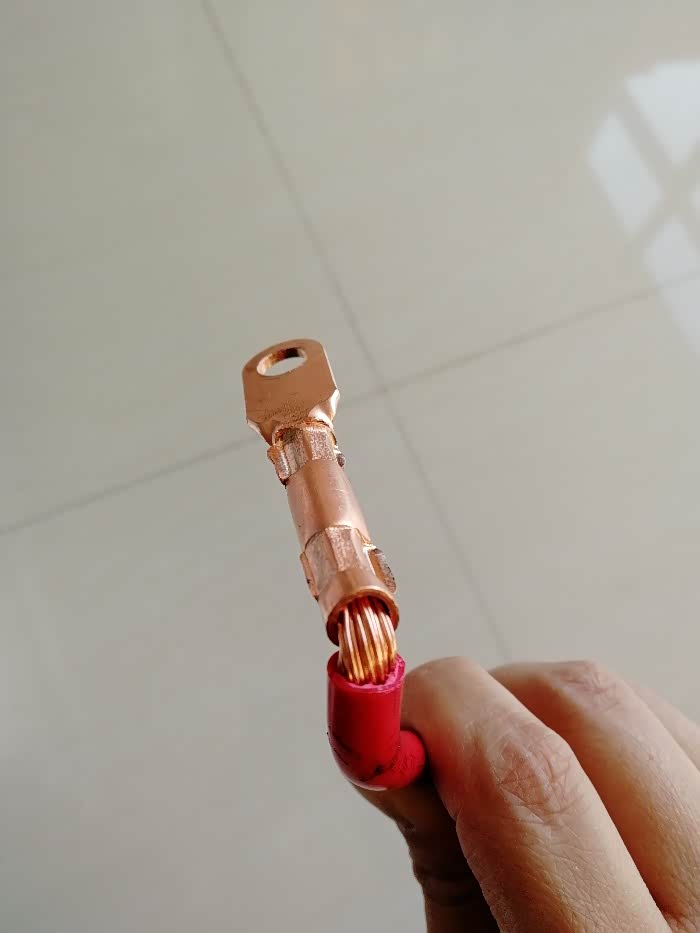 根据铜鼻子长度,剥开适当长度的线皮,将铜丝穿进去,液压钳压实即可,注意剥线皮的时候不要切断里面的铜丝。