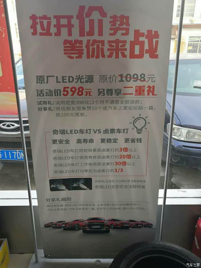 微信号中看到有奇瑞瑞虎5车换原厂LED灯,很高兴休班就去4S店了。一大早去的人家还沒有上班在那等了半个小时今天第一个换的,很高兴,活动原价1098元LED灯活动价只要598集赞50个或者汽车之家发帖就可以抵扣尾款200洋。良心价格,如果远光也能换了就太好了,色温6000K雨天或者雾天效果怎么样,原车LED车灯安装也非常方便,无损原位安装方便快捷调试无散光现象,期待晚上LED大灯测试。