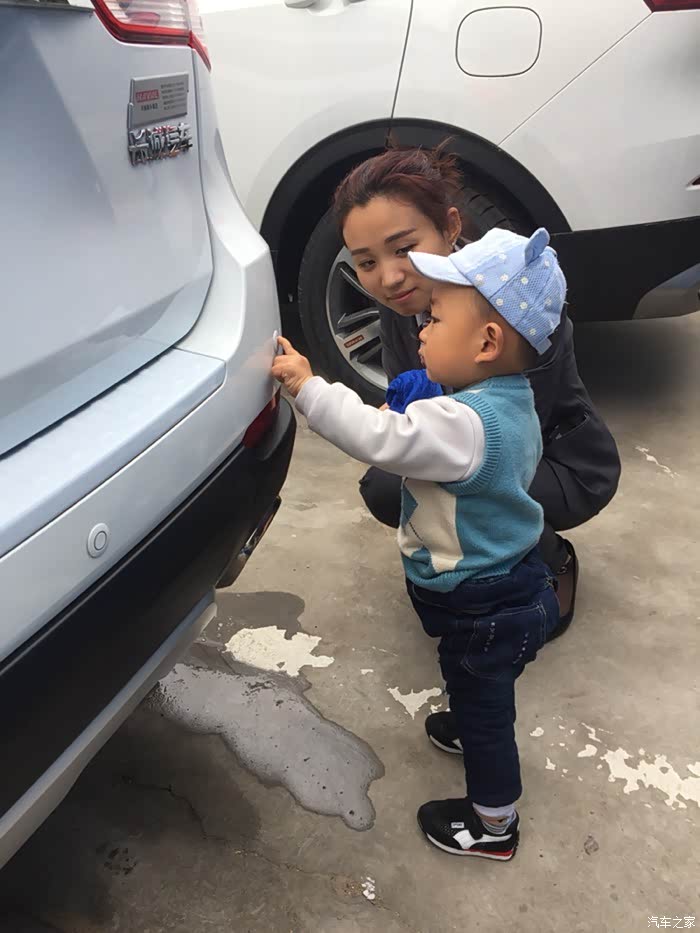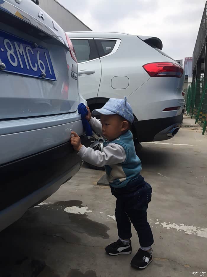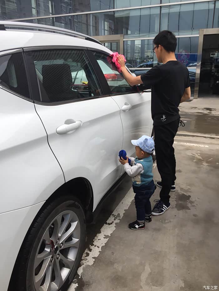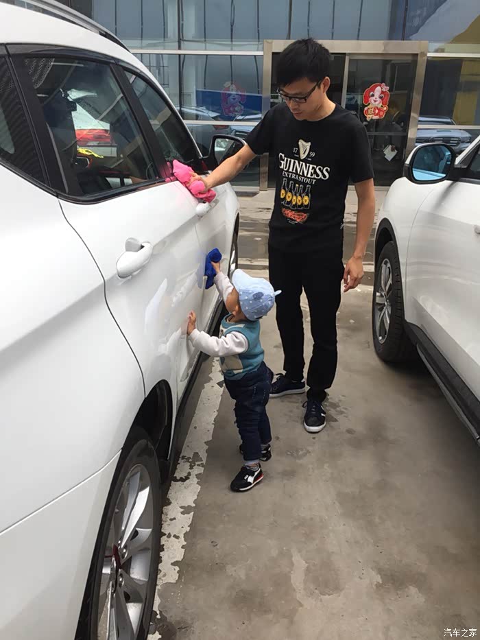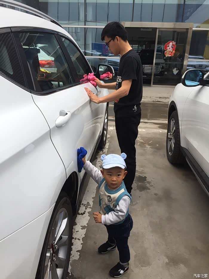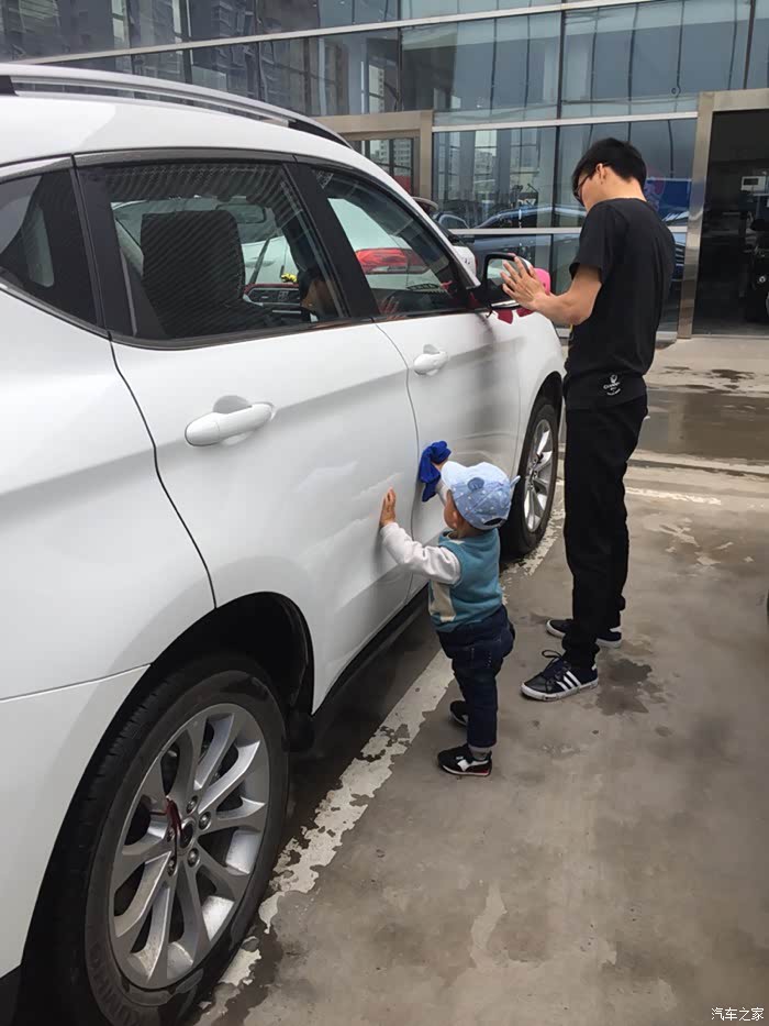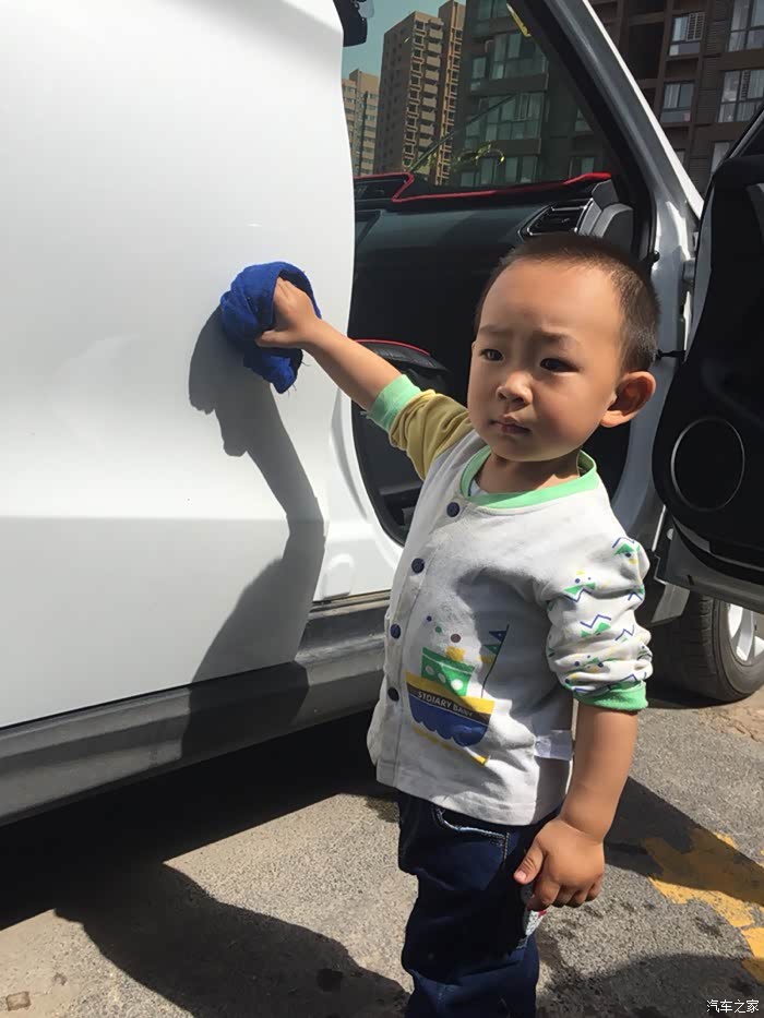 儿子早以等不及了,车刚停好就拿着抹布要擦车了!