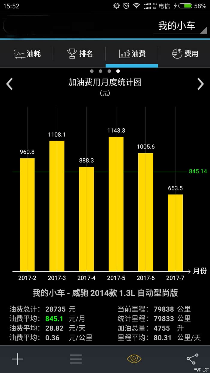 到底加92还是加95?每次加油我都记录了下来,目前已经加了2万8千多块钱油,平均每天跑了80公里。关于92和95的油到底加哪个,我最初几千公里一直加92,后来试了试95,发现95油耗更低,但是差距并不大,百公里估计低0.3个左右,因为本身油耗就不高,一直就是5点多的油耗,后来又在市区测试了几箱油,发现在市区加95就不划算了,油耗比92要高。