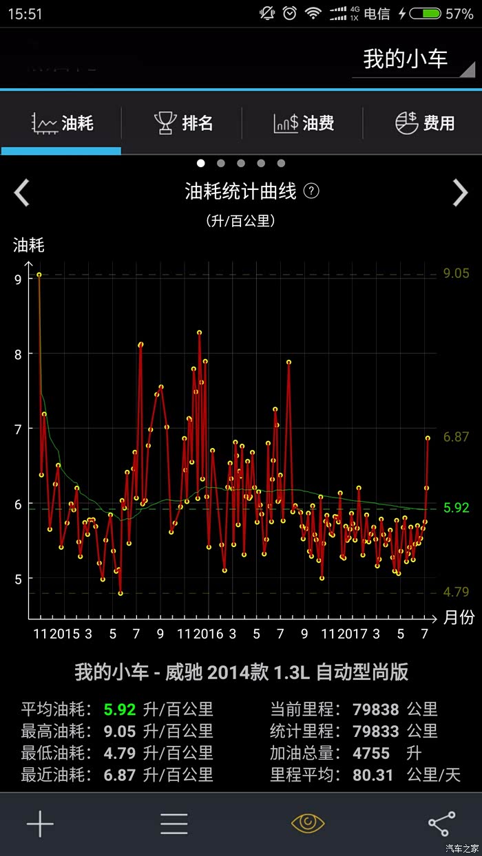 丰田威驰还是出了名的省油的,我的行驶线路以高速和国省道居多,所以油耗一直很低。从买车第一天统计至今,百公里平均油耗为5.92升,最低油耗开出过4.79。不开空调基本上都是5点几,开空调的时候也就七个油左右。开车还是匀速行驶最省油,不暴力驾驶,如果路况好,相信大家都可以开出很低的油耗,经常市区堵车的肯定油耗高。