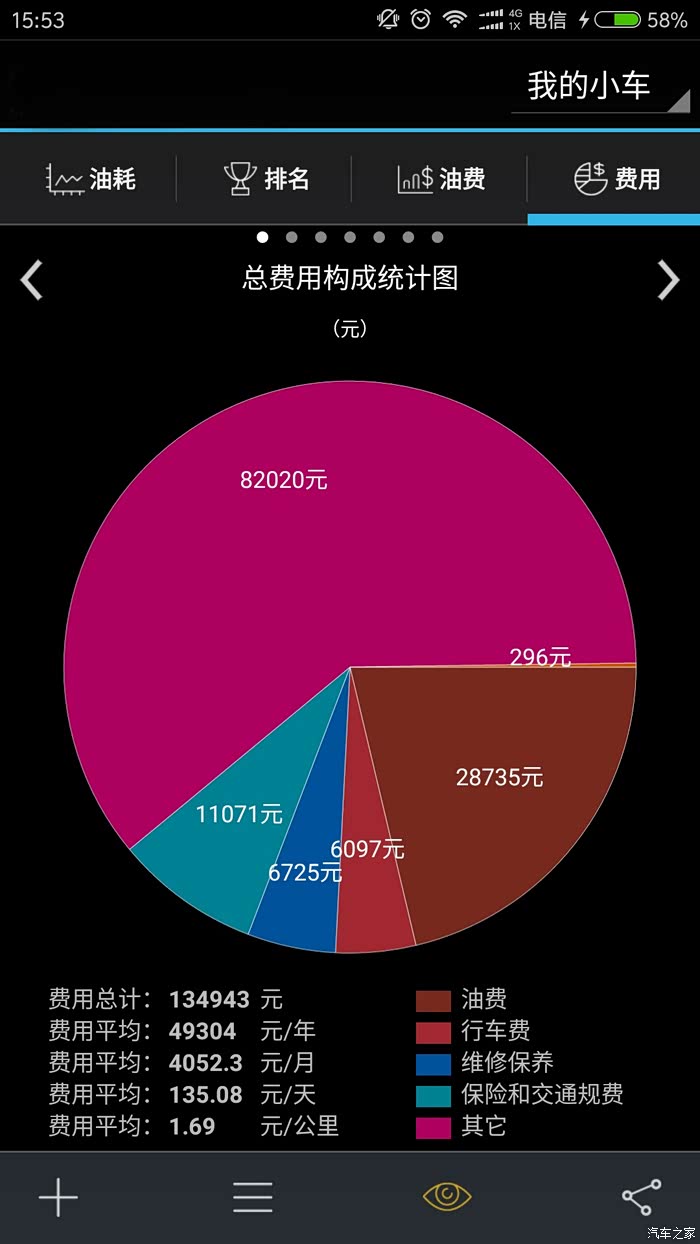 六、停车费:296元,单位有地方停,回家就停马路边,所以这项费用很低,洗车也是单位的福利,从来没花过钱。