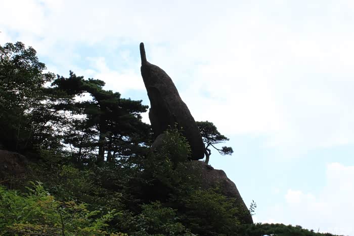 此松是黄山松的代表,乃至整个黄山的象征,它恰似一位好客的主人,挥展双臂,热情欢迎海内外宾客来黄山游览。此外,还有送客松、陪客松。迎客松在玉屏楼左侧、文殊洞之上,倚青狮石破石而生,高10米,胸径0.64米,地径75厘米,枝下高2.5米,树龄至少已有800年,黄山"四绝"之一。其一侧枝桠伸出,如人伸出一支臂膀欢迎远道而来的客人,另一只手优雅地斜插在裤兜里,雍容大度,姿态优美。是黄山的标志性景观,景物。