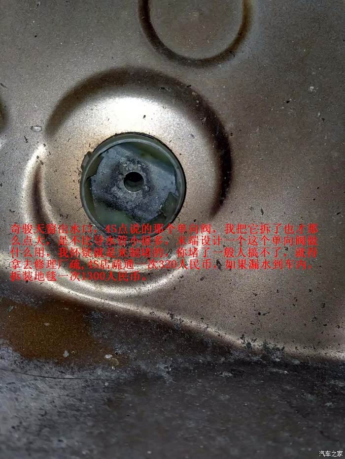 作为消费者觉得,厂家这个天窗设计有缺陷或者天窗的密封条存在尺寸短缺的问题,不能很好的和车体结合,导致漏水。虽然厂家设计有导水槽加导水管,但是缝隙明显过大,进水量远远超出排水量,不开天窗颗粒灰尘都能流入倒水槽,然后进入导水管。并且在导水管末端设计一个单向阀是违背常理的设计,有这个单向阀后加上天窗密封性能缺陷,天窗漏下来的水就在单向阀里产生结构,致使单向阀堵塞,单向阀堵塞后,天窗漏水就无法通过导水管流出,致使漏水累积在天窗导槽里面,累积多了就从车顶内衬两边A柱网车内流。