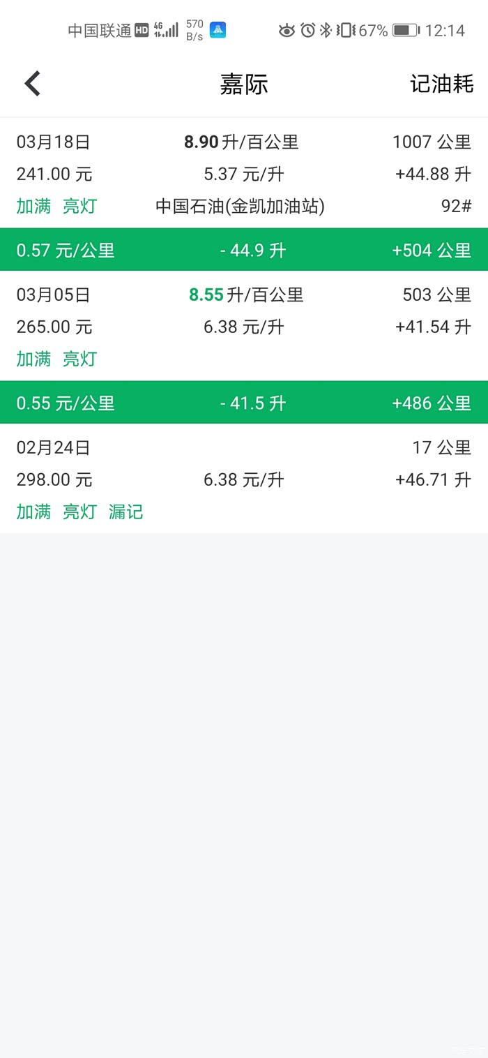 标称容量52L,刚提车的时候加过46.7,最近一次油灯亮了还跑了40公里市区道路,到跳枪只加了44.88L。以前开的帝豪,标称50L,最多加过55.4L。想问下有没有车友试过在不断油熄火的前提下,嘉际最多能加多少油?油灯亮了在市区里还能跑多少公里?