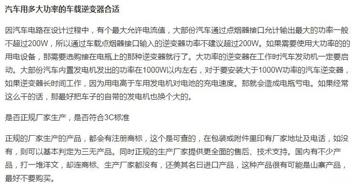 买什么样的逆变器比较合适,主要是考虑车的电瓶容量,,和发电机参数!英伦SC715的电瓶是12V60AH的参数,而配套的发电机是14V90A.,全车的供电在车不发动时,完全由电瓶供给,而在发动和行驾时,则由发电机和电瓶共同供给!